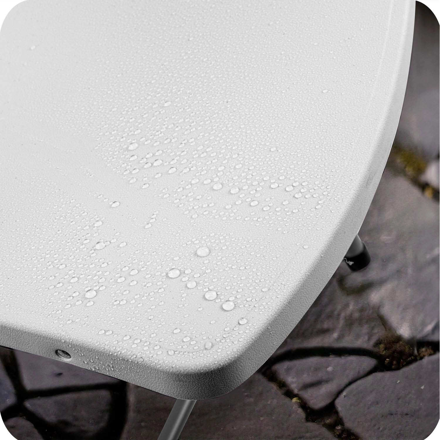 Stola se zložita v raven format, zato zavzameta minimalno prostora pri shranjevanju. Vodoodporna in UV odporna površina se enostavno čisti in hitro suši, kar boste cenili pri zunanji uporabi, cateringu in domačih zabavah. Nedrseči zaključki na nogah ščitijo tla in povečujejo stabilnost.