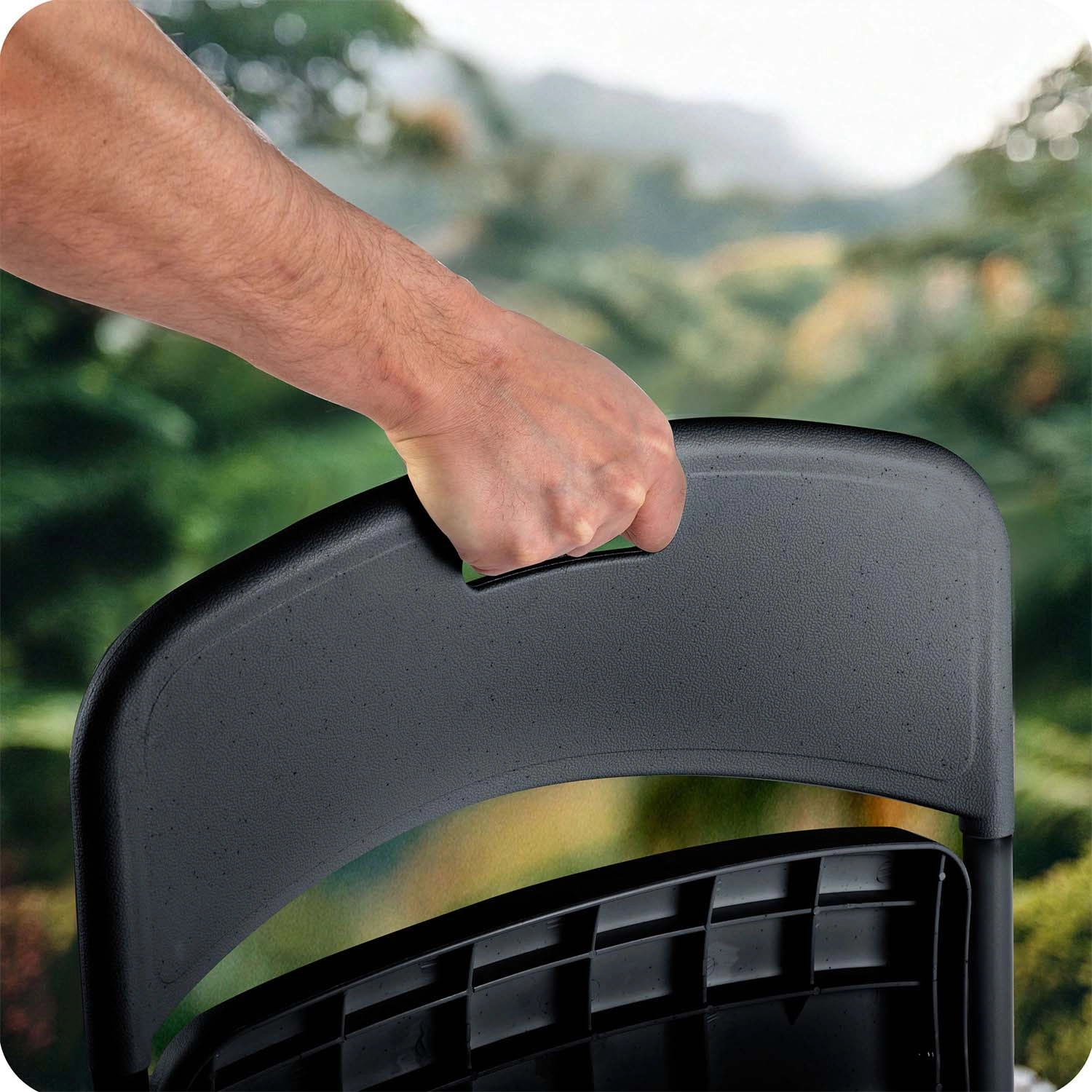 V naslonu je praktičen izrez z ročajem, ki omogoča udobno prenašanje ter hitro razpiranje in zlaganje stola – idealno za pogosto seljenje in dogodke.