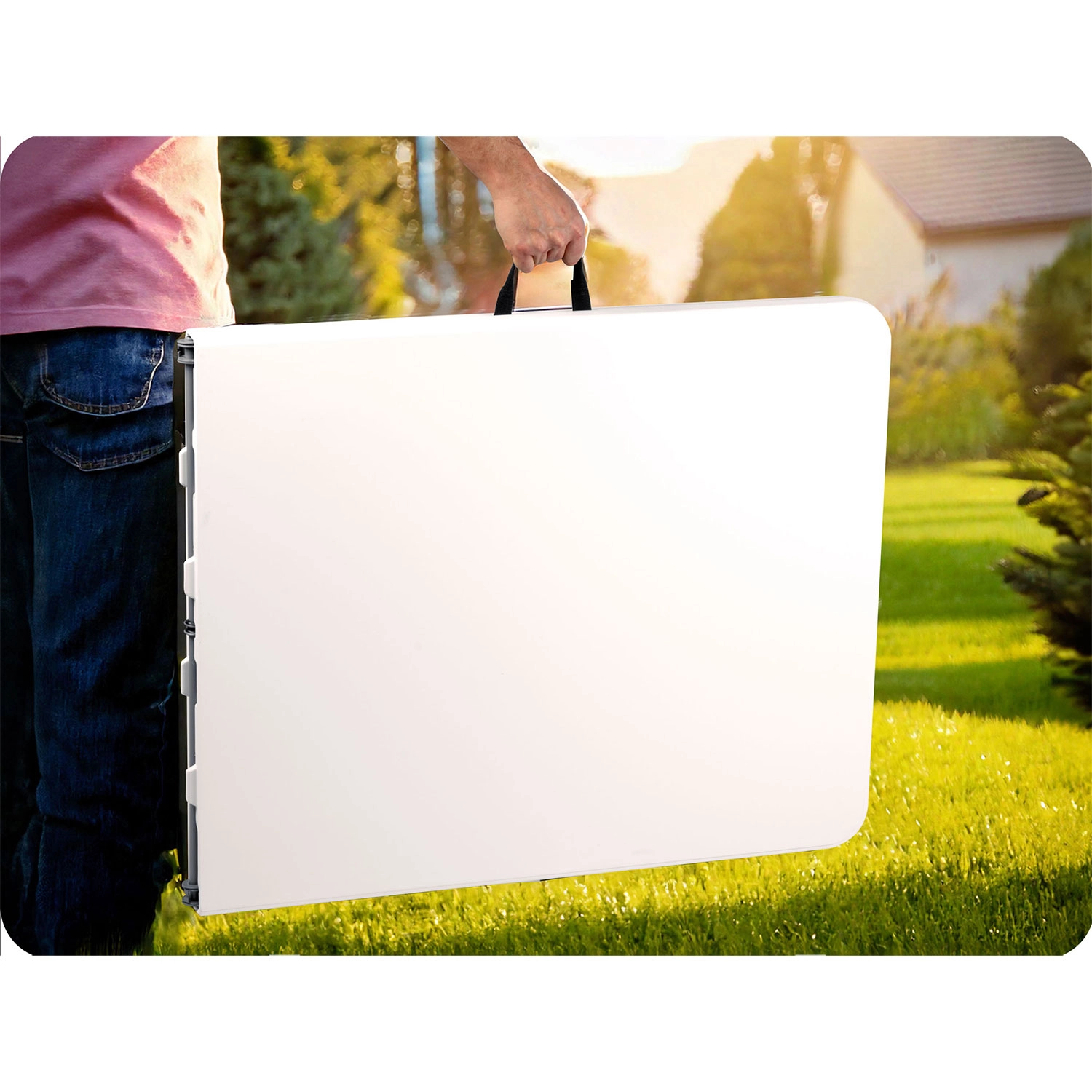 Miza se zloži na pol v ploščat kovček s priročnim ročajem. Idealno za hitre premike med vrtom, teraso ali dogodkom ter za varčno shranjevanje.