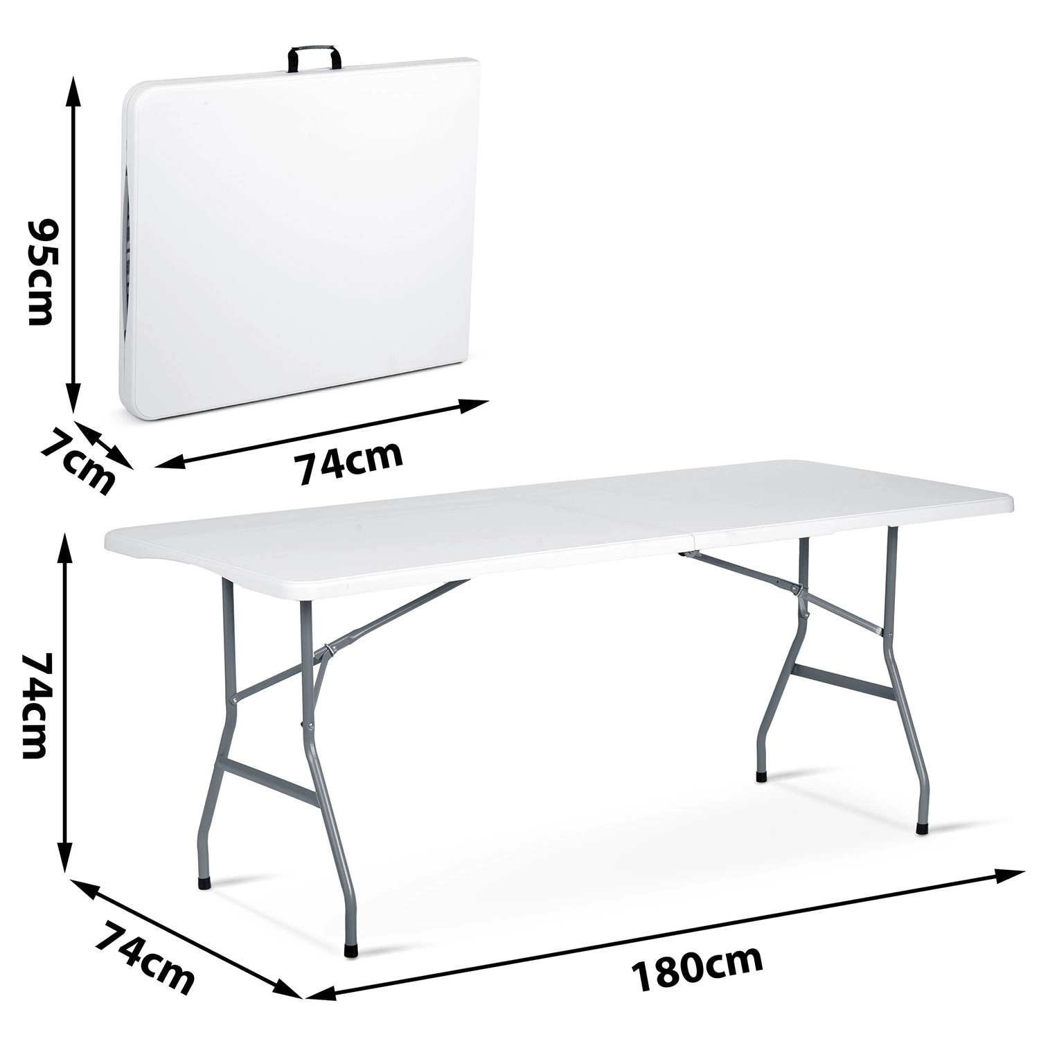 Zanesljiva zložljiva miza 180 cm je odlična izbira za vrt, teraso in notranje prostore. Robustni jekleni okvir s praškastim lakom zagotavlja stabilnost in dolgo življenjsko dobo, medtem ko je PE-plošča odporna na vodo, UV in madeže. Zahvaljujoč zložljivi zasnovi jo v hipu postavite in po dogodku preprosto pospravite.