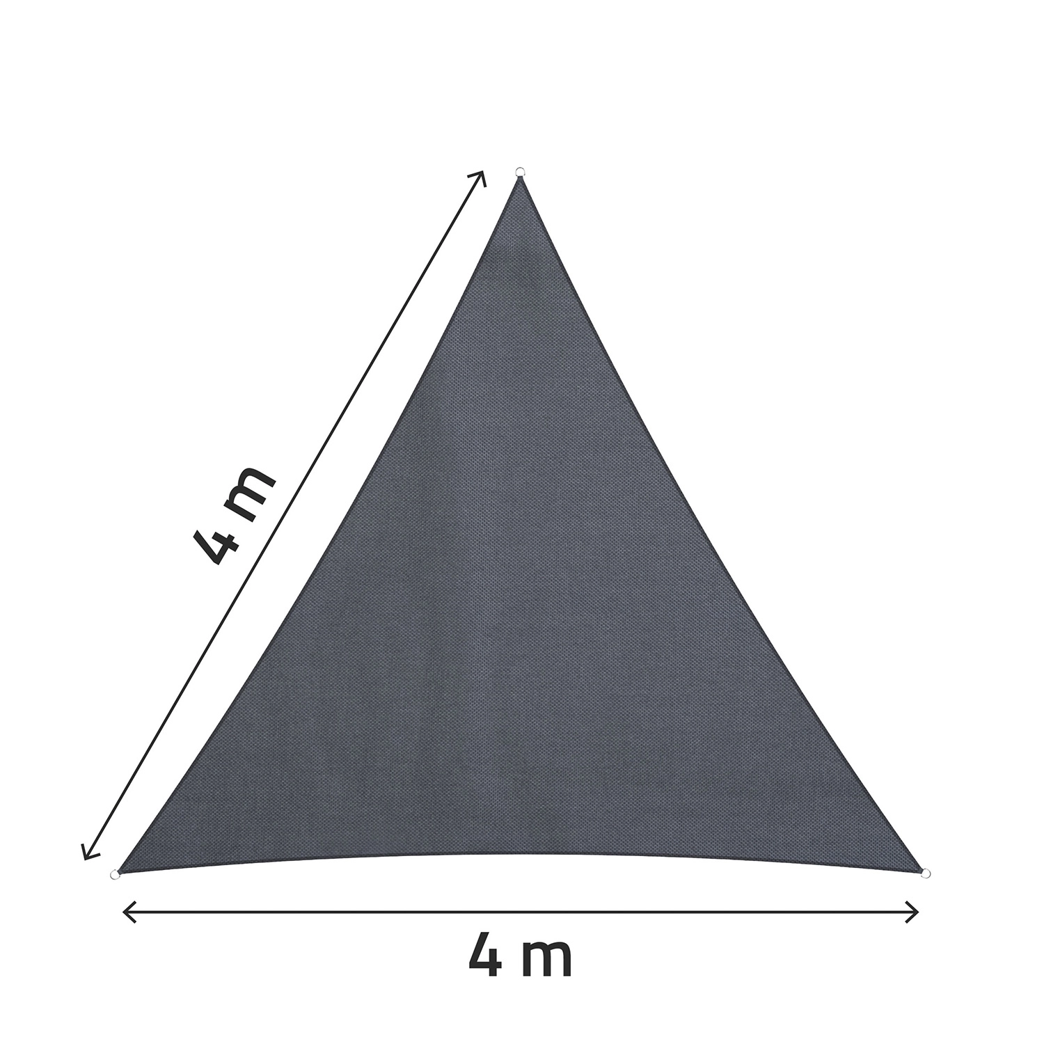 To sivo trikotno senčno jadro z dolžinami stranic 400 × 400 × 400 cm zagotavlja veliko površino sence tam, kjer jo ravno potrebujete. Gosto tkani polietilen (PE) 180 g/m² je odporen na vremenske vplive, prepušča manj sončnih žarkov in hkrati ščiti pred lahkimi plohami – kapljice zlahka spolzijo s površine.