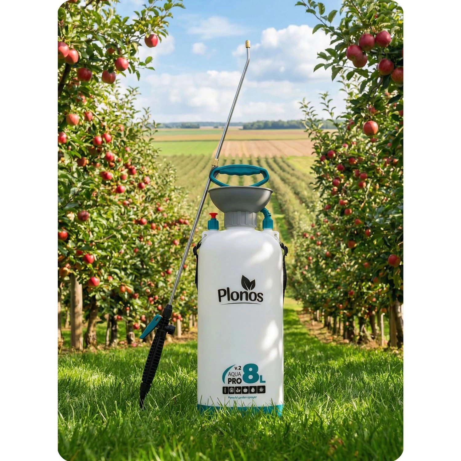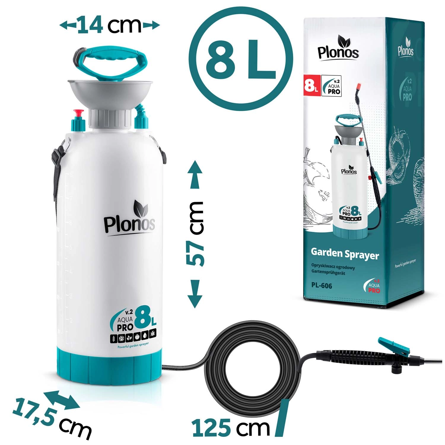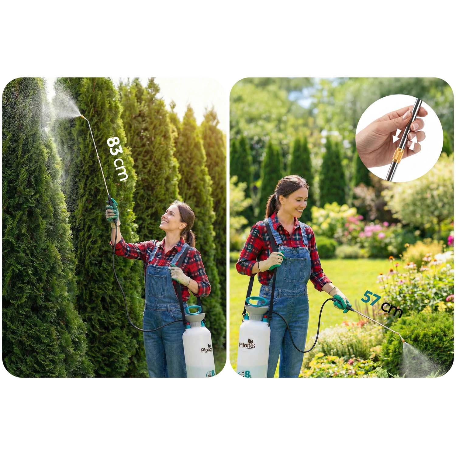 Razpršilnik Plonos 8 l je zanesljiv pomočnik za vsakodnevna vrtnarska dela. Zahvaljujoč kakovostnim materialom – nerjavnemu jeklu, medenini in trpežnemu PE – dobro prenaša kemična sredstva in dolgotrajno uporabo. Nadzorovan tlak 2,76 bar enakomerno razporeja tekočino in zagotavlja natančne rezultate pri škropljenju cvetja, zelenjave, grmovnic in dreves.