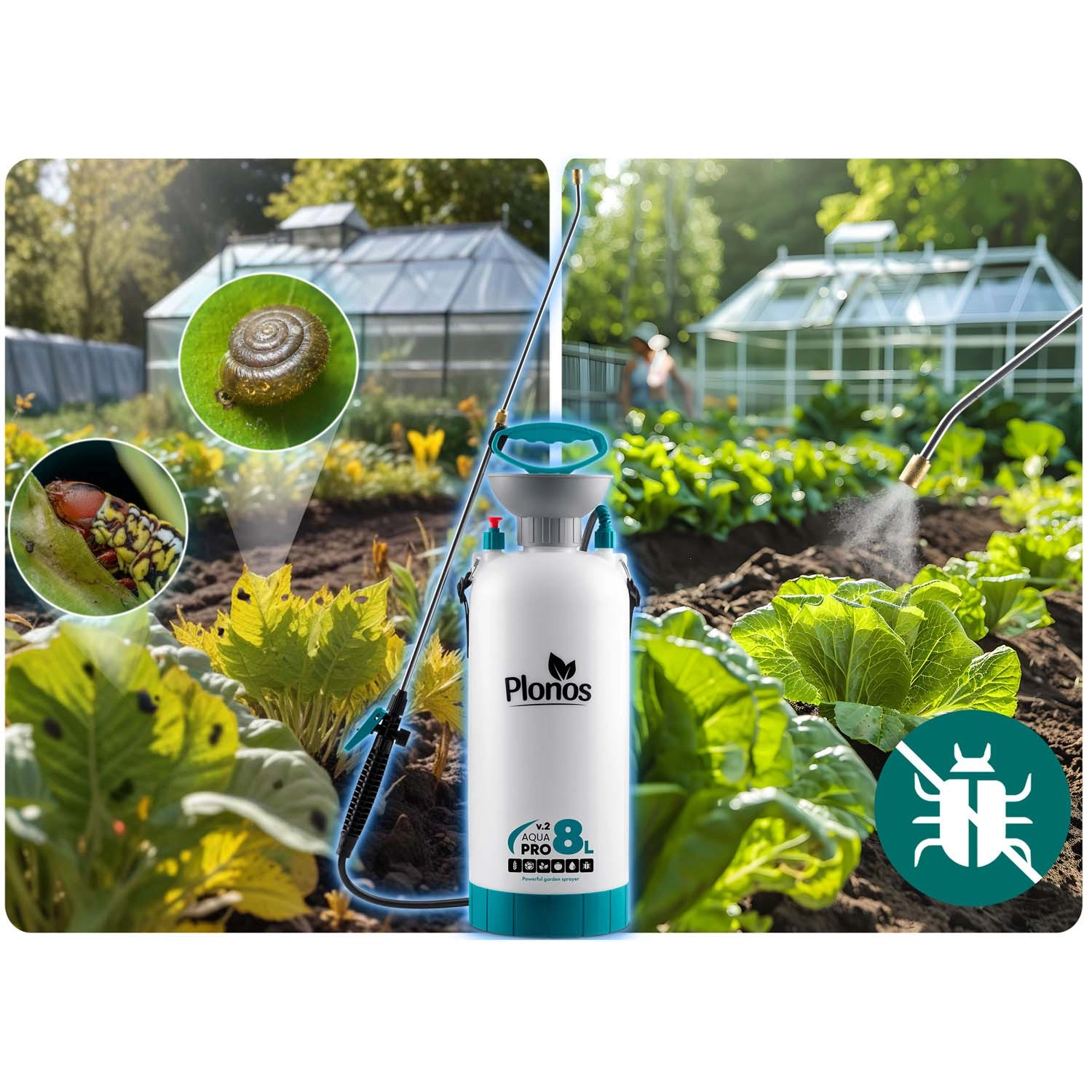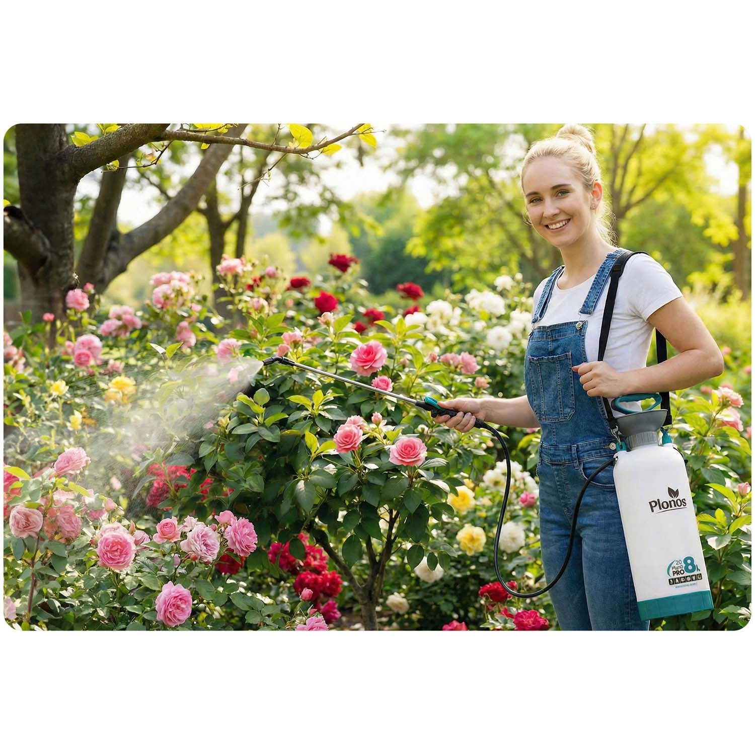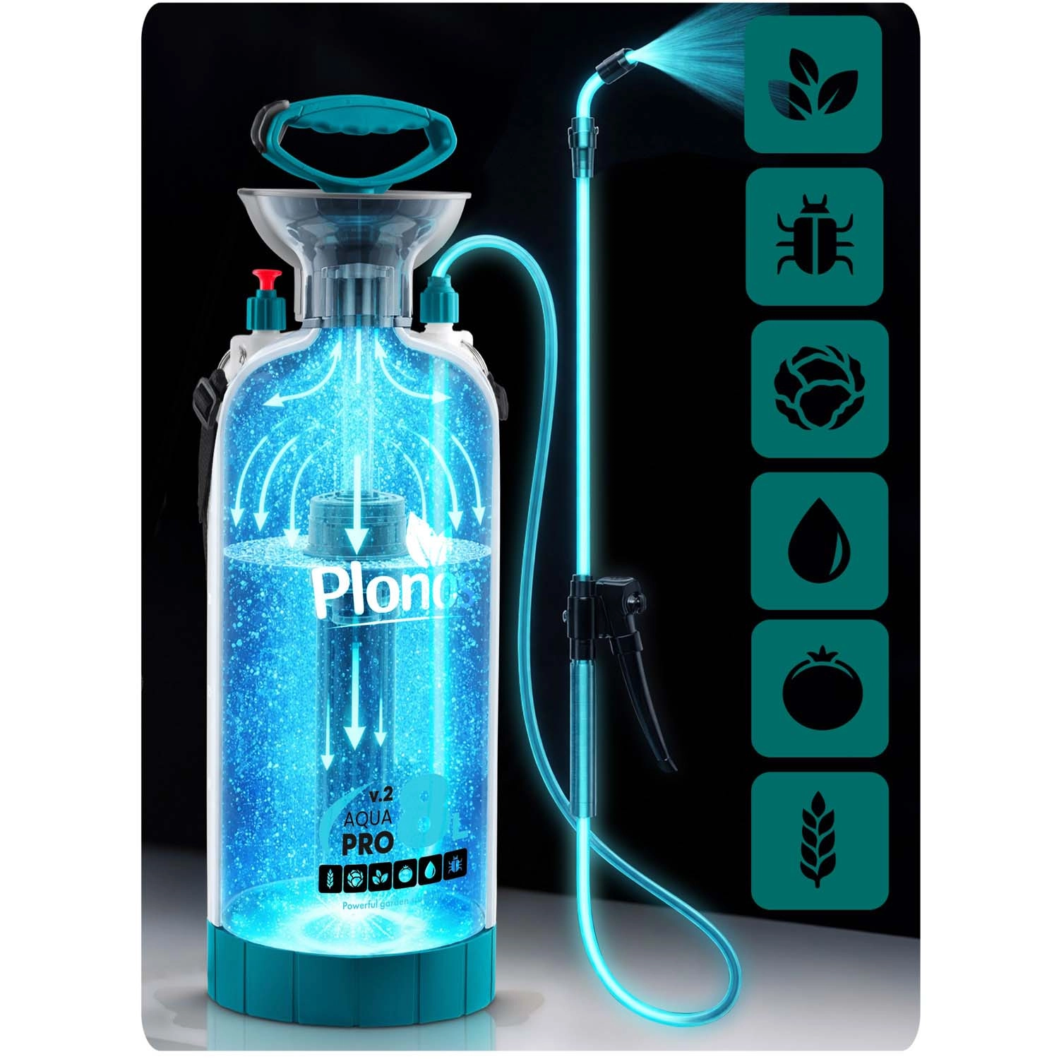 Razpršilnik Plonos 8 l je zanesljiv pomočnik za vsakodnevna vrtnarska dela. Zahvaljujoč kakovostnim materialom – nerjavnemu jeklu, medenini in trpežnemu PE – dobro prenaša kemična sredstva in dolgotrajno uporabo. Nadzorovan tlak 2,76 bar enakomerno razporeja tekočino in zagotavlja natančne rezultate pri škropljenju cvetja, zelenjave, grmovnic in dreves.