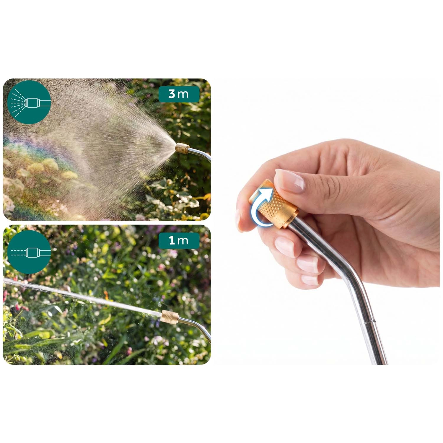 Praktična nastavljiva lanceta (57–83 cm) razširi doseg brez sklanjanja in omogoča enostavno usmerjanje tudi na težje dostopna mesta. Medeninasta šoba z gladko nastavitvijo preklaplja od nežne meglice do neprekinjenega curka z enim zasukom. Vstopni lijak olajša čisto polnjenje brez polivanja, ojačan ramenski pas pa poveča udobje pri daljšem delu.