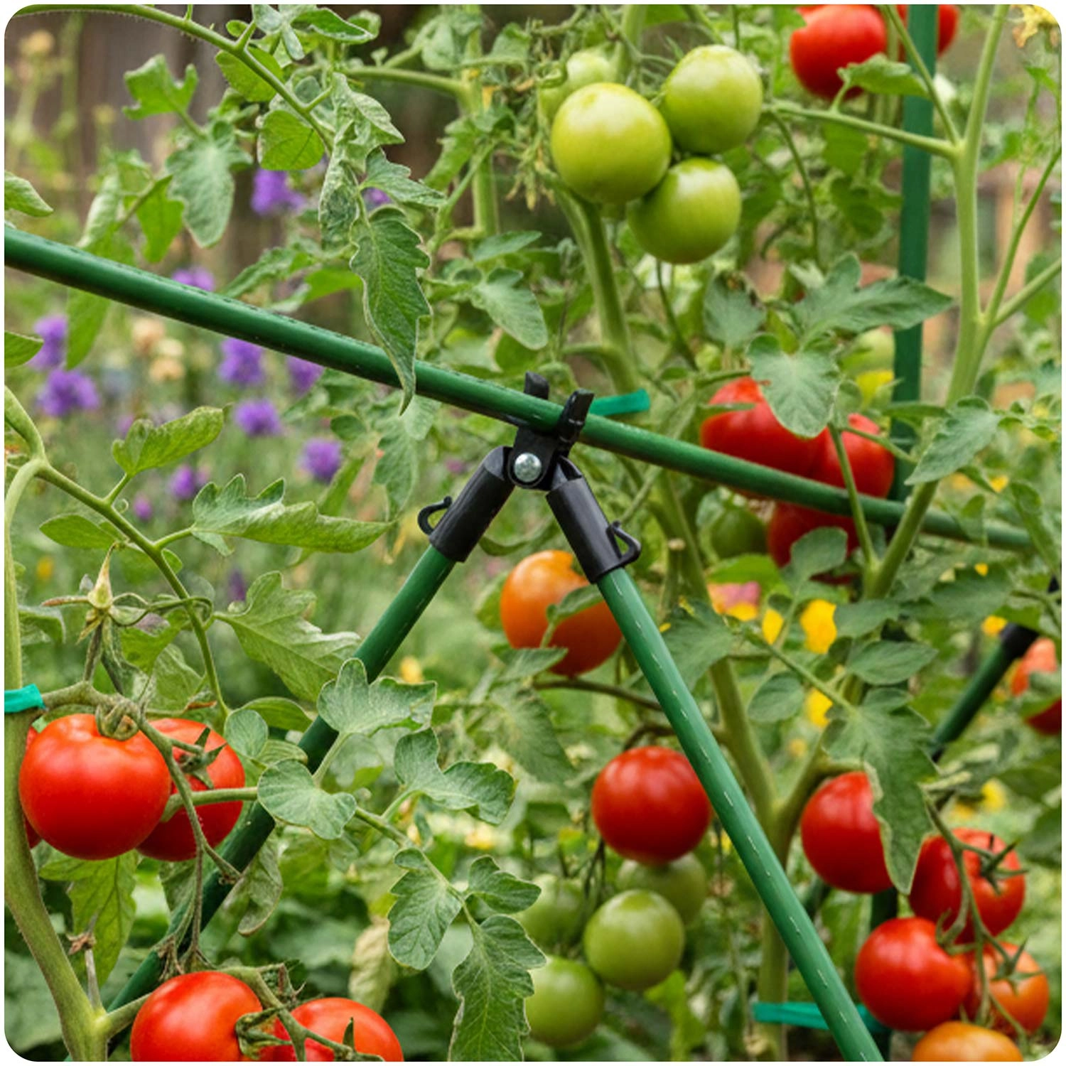 Ogrodje iz 11‑mm palic, povezanih s temi spojkami, zagotovi zanesljivost tudi za obtežene poganjke paradižnika ter olajša privezovanje in oblikovanje rastlin.