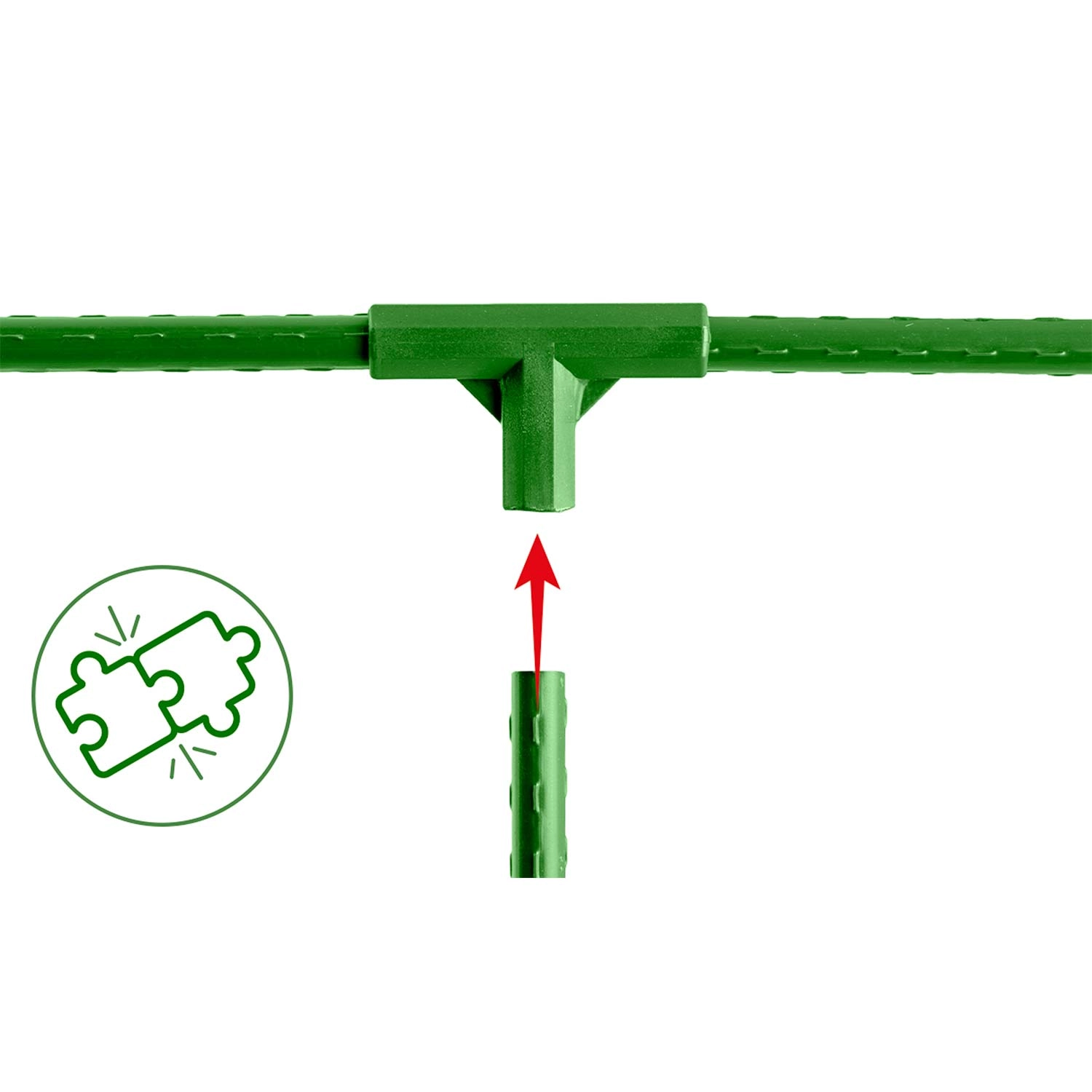 Gladko, čvrsto plastično T-telo ustvarja pravi kot za prečnike in mreže. Spoj je tesen in stabilen tudi ob obremenitvi z rastlinami.