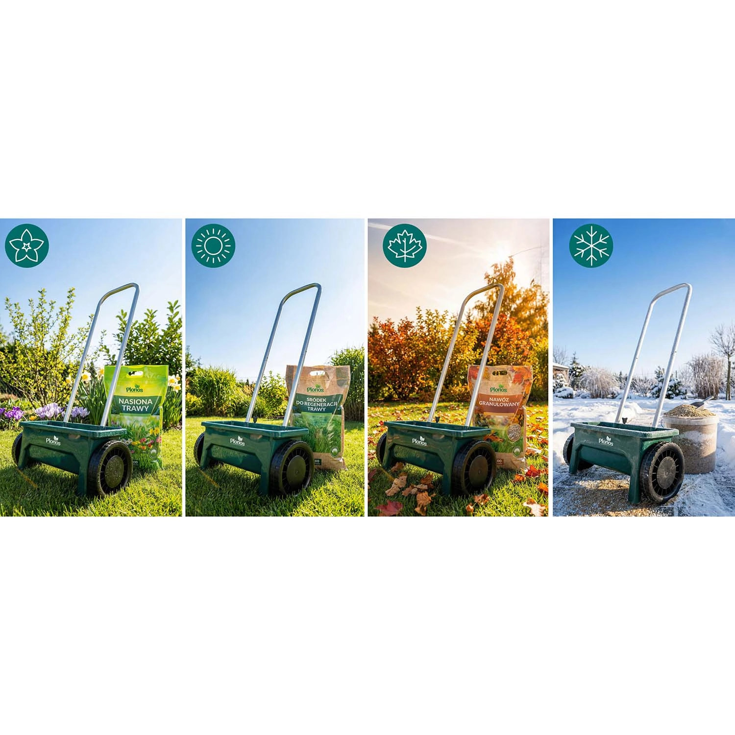 Sejanje in gnojenje v sezoni, pozimi pa sol in pesek za pločnike ter dovozne poti. Eno orodje za vse leto.