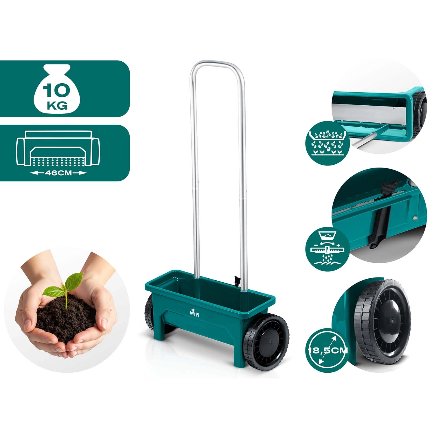 Vzdržljiv plastični zalogovnik je preprosto pralni, velika kolesa pa zagotavljajo gladko vožnjo tudi na neravnem terenu. Ergonomski ročaj zmanjšuje utrujenost pri daljšem delu, ročni pogon pa zagotavlja enostavno, takojšnjo pripravljenost brez zahtevnega vzdrževanja.