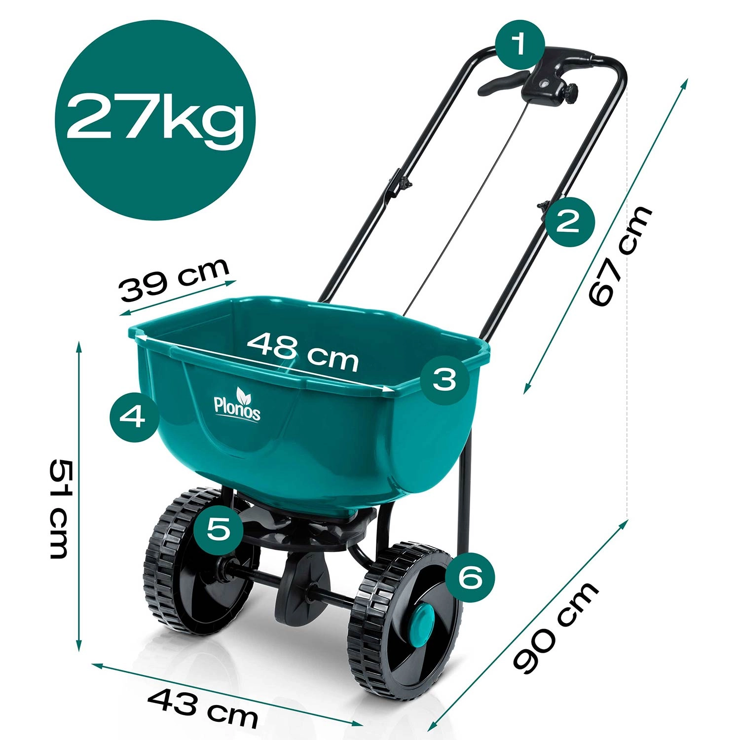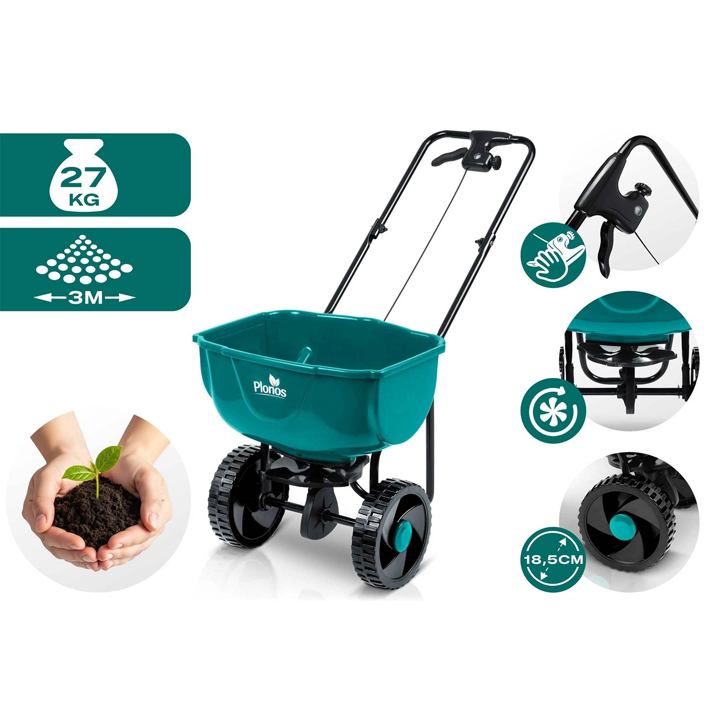 Velika kapaciteta 27 l (do 27 kg) podaljša delovne intervale brez pogostega dosipavanja. Velika kolesa omogočajo gladko gibanje tudi po neravnem terenu, trpežen plastičen zalogovnik pa se enostavno čisti. Trosilnik je idealen za pomlad (setev trate), poletje (gnojenje in obnova), jesen (utrjevanje trate pred zimo) in zimo (posip soli ali peska po poteh in dovozih).