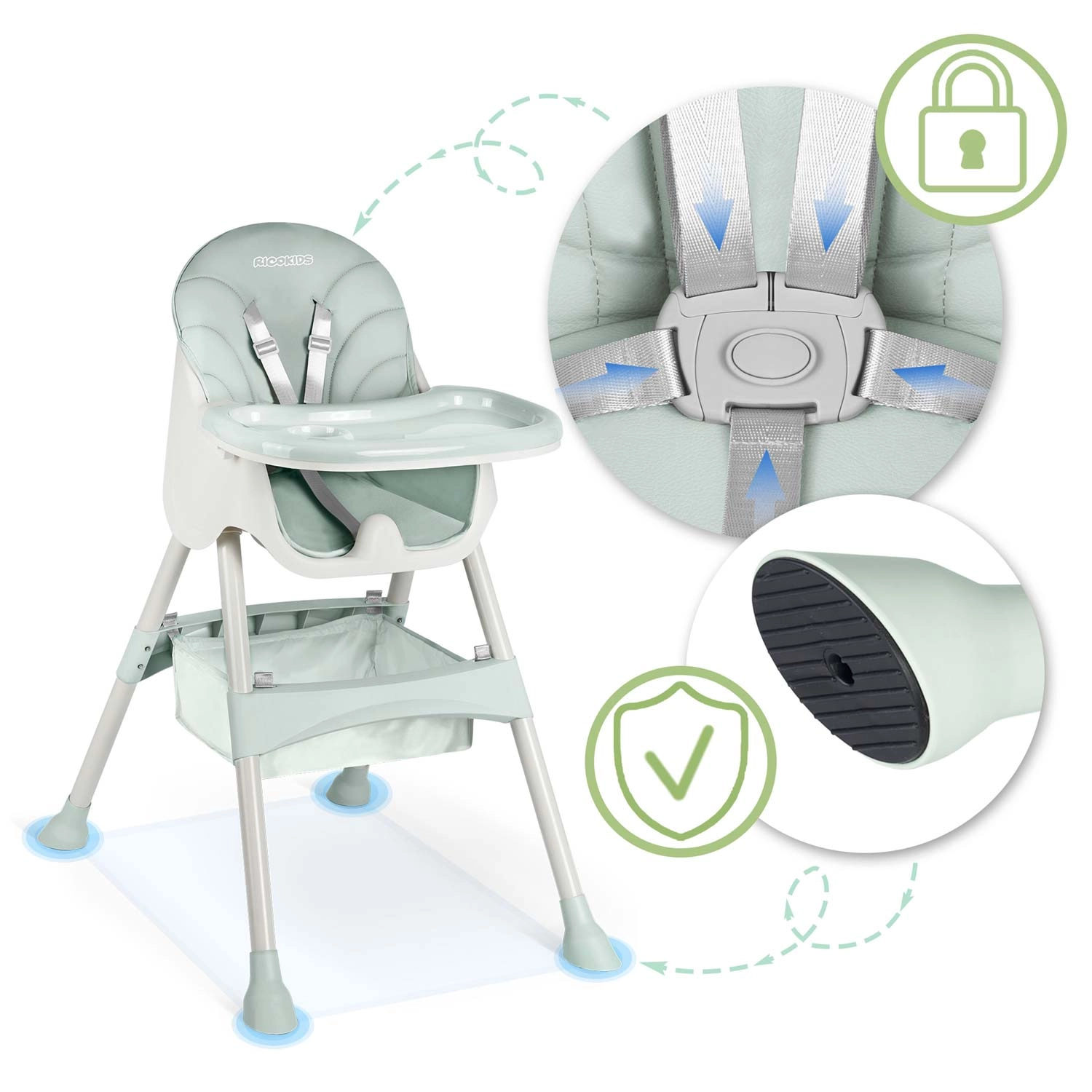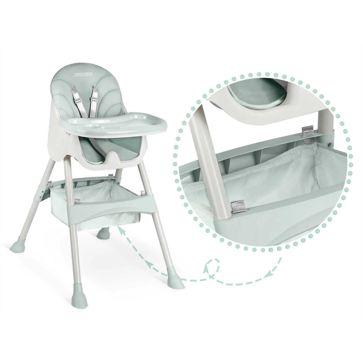 Varnost zagotavljajo 5-točkovni pasovi in nedrseče nogice, ki stolček stabilno držijo na katerikoli podlagi. Zložljiva konstrukcija prihrani prostor – zložite jo v hipu in enostavno shranite. Del paketa je tudi praktična košara za igrače in drobnarije, da imate vse potrebno vedno pri roki.