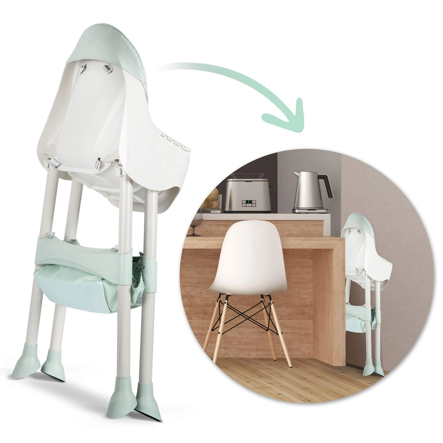 Visok stolček za hranjenje, nizek sedež in booster – z enim klikom spremenite konfiguracijo glede na starost in potrebe otroka.