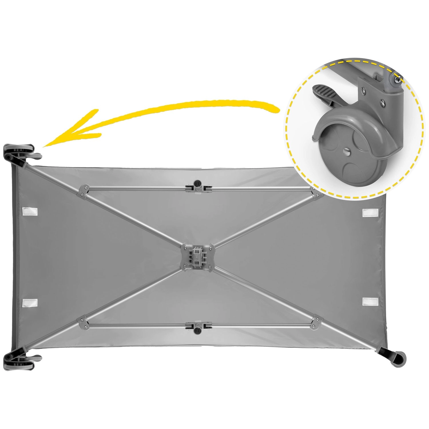 Praktična potovalna posteljica z dodatno opremo za udoben spanec in varno igro doma in na poti. Ponuja dve višinski ravni ležišča, stranski vhod na zadrgo, kolesa z zavoro, previjalno mizo, lok z igračami, organizator in žep ter zložljivo vzmetnico in transportno torbo v kompletu. Je lahka, enostavna za zlaganje in izpolnjuje evropske varnostne standarde.