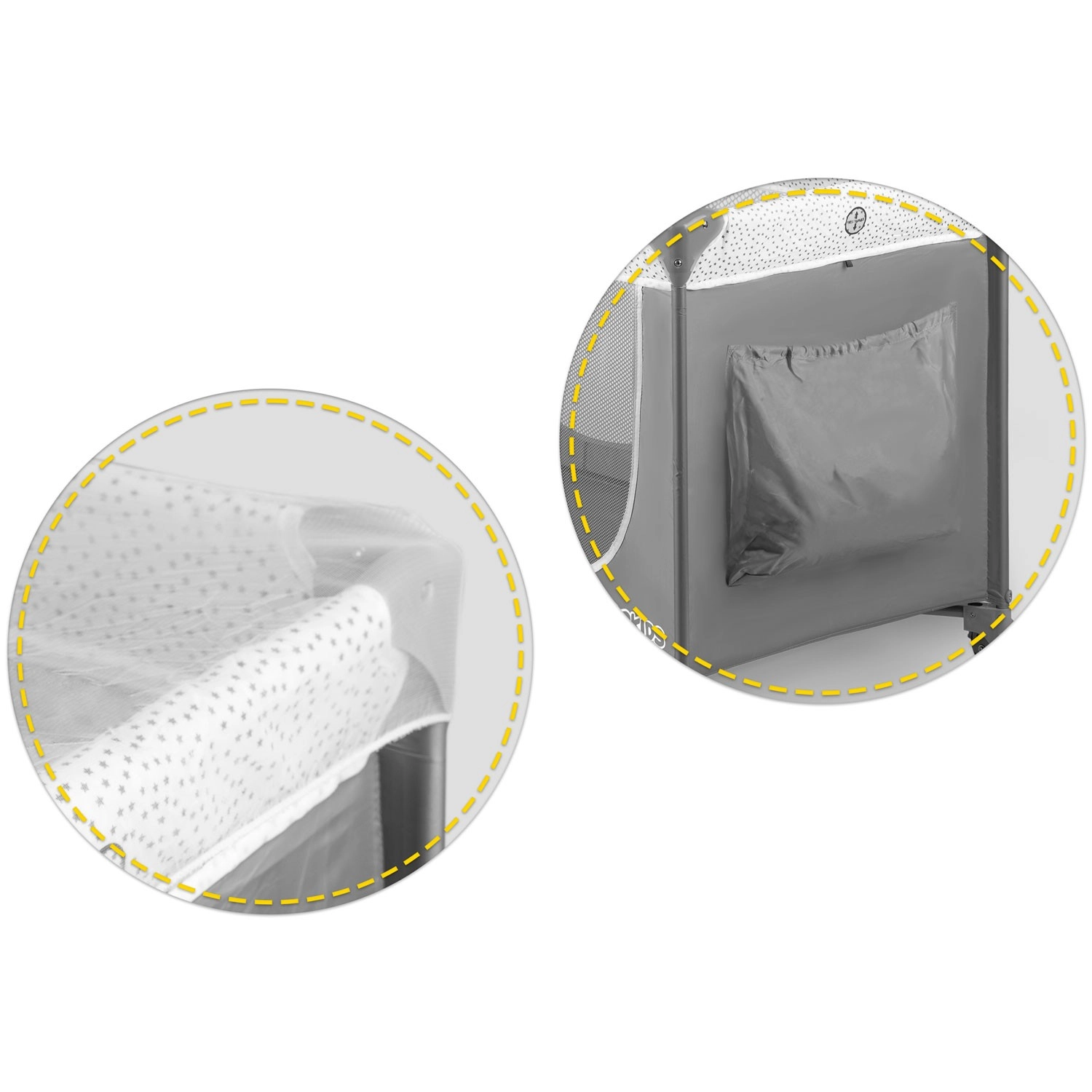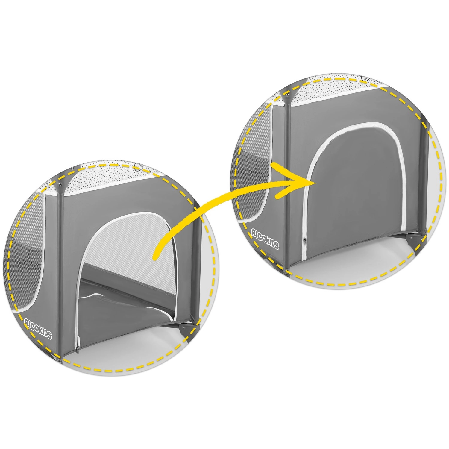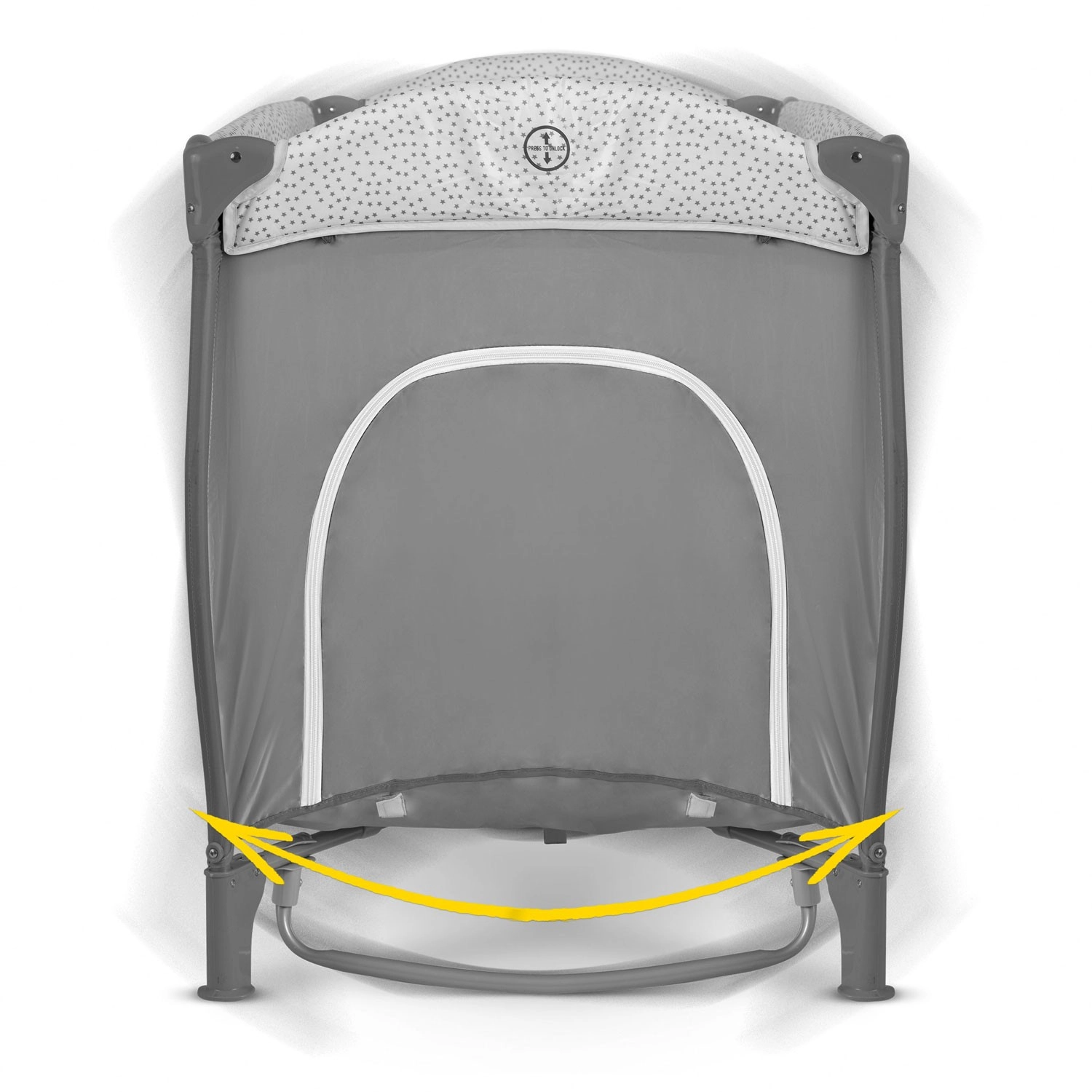 Potovalna posteljica v elegantni sivi barvi je zasnovana za največje udobje in varnost otroka ter priročnost za starše. Zahvaljujoč dvema višinama ležišča jo zlahka prilagodite starosti in potrebam dojenčka. Stranski vhod na zadrgo omogoča samostojno plezanje starejših otrok, medtem ko zračne mrežaste stranice poskrbijo za odlično kroženje zraka in pregled.