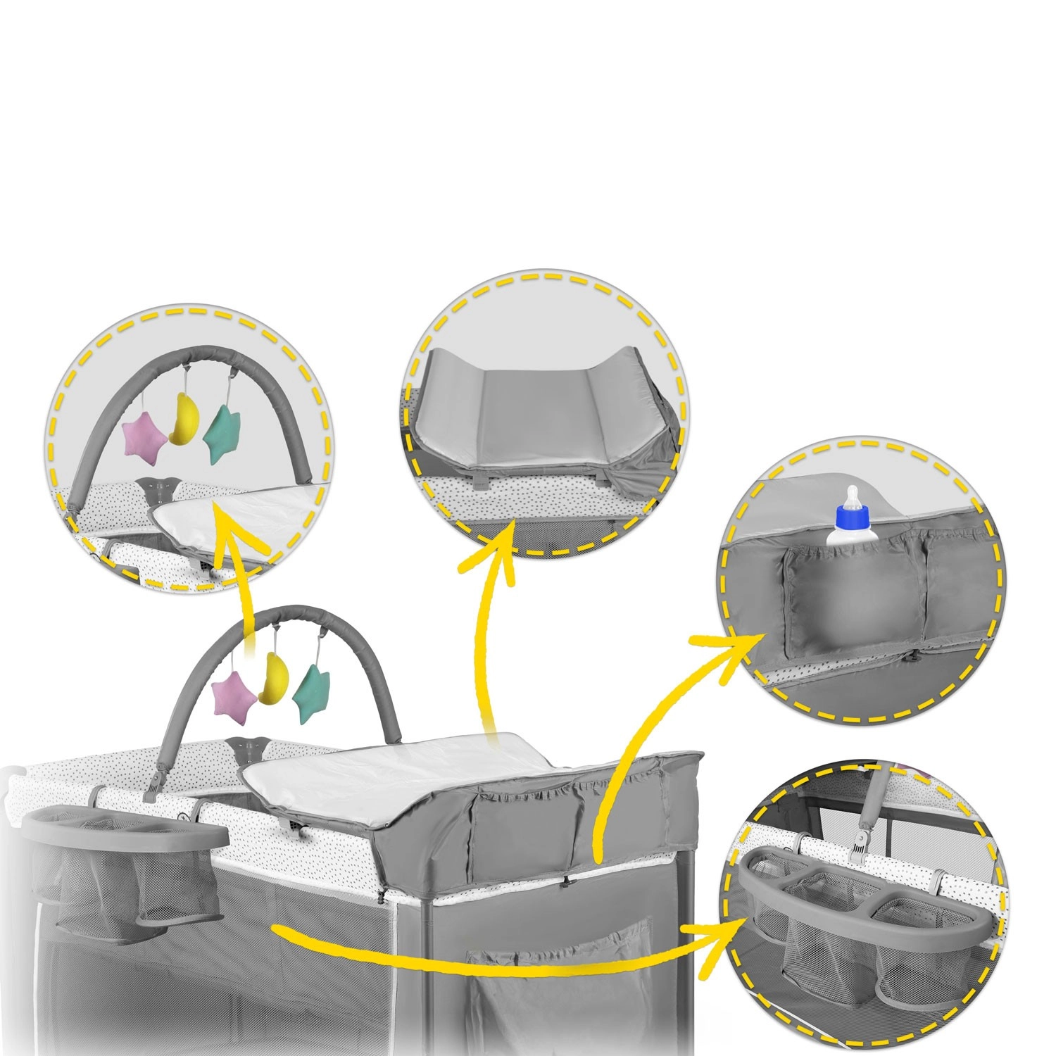 Popolna oprema: previjalna podloga, lok z igračami, stranski žepi in organizator za pleničke in stekleničke. Vključuje zložljivo vzmetnico in transportno torbo.