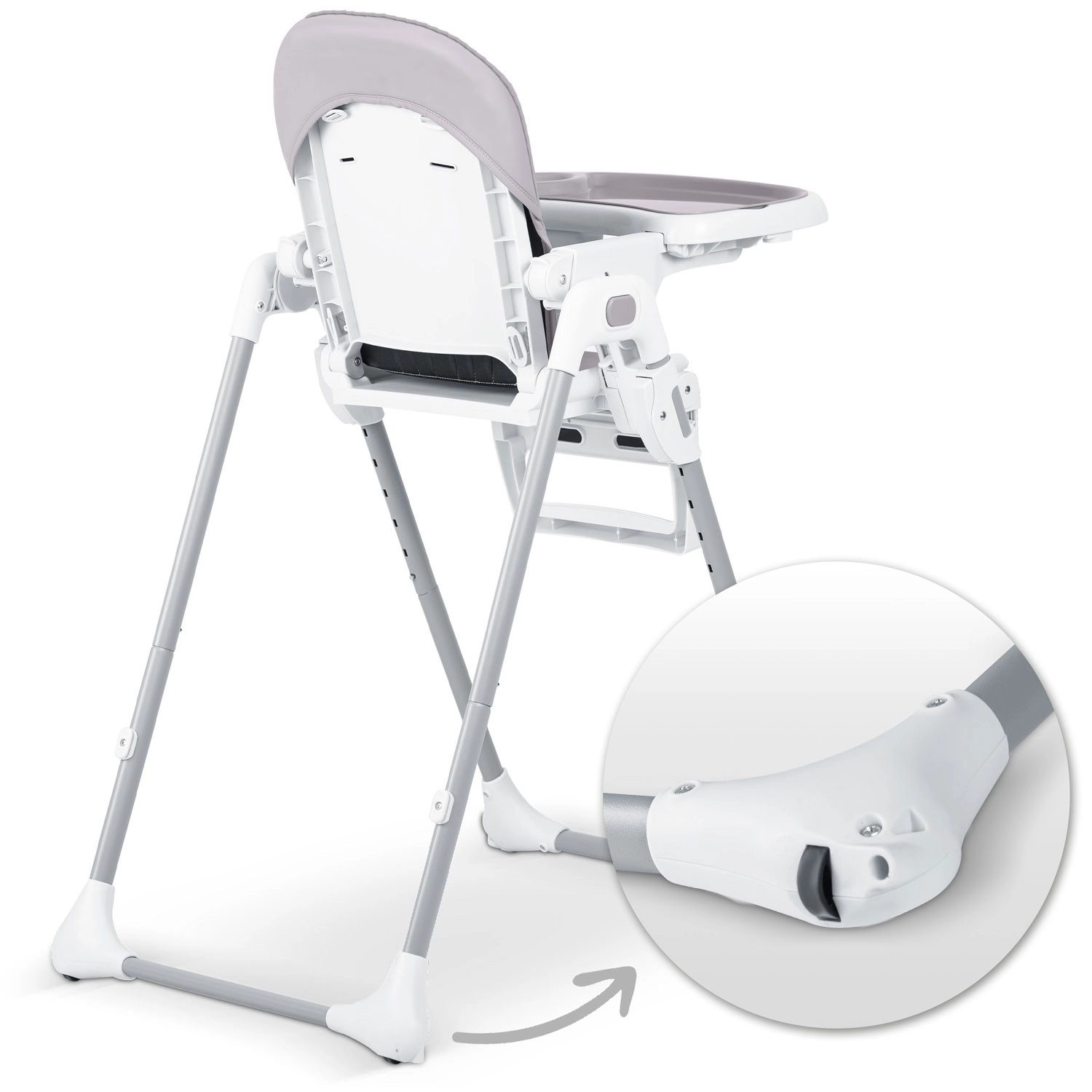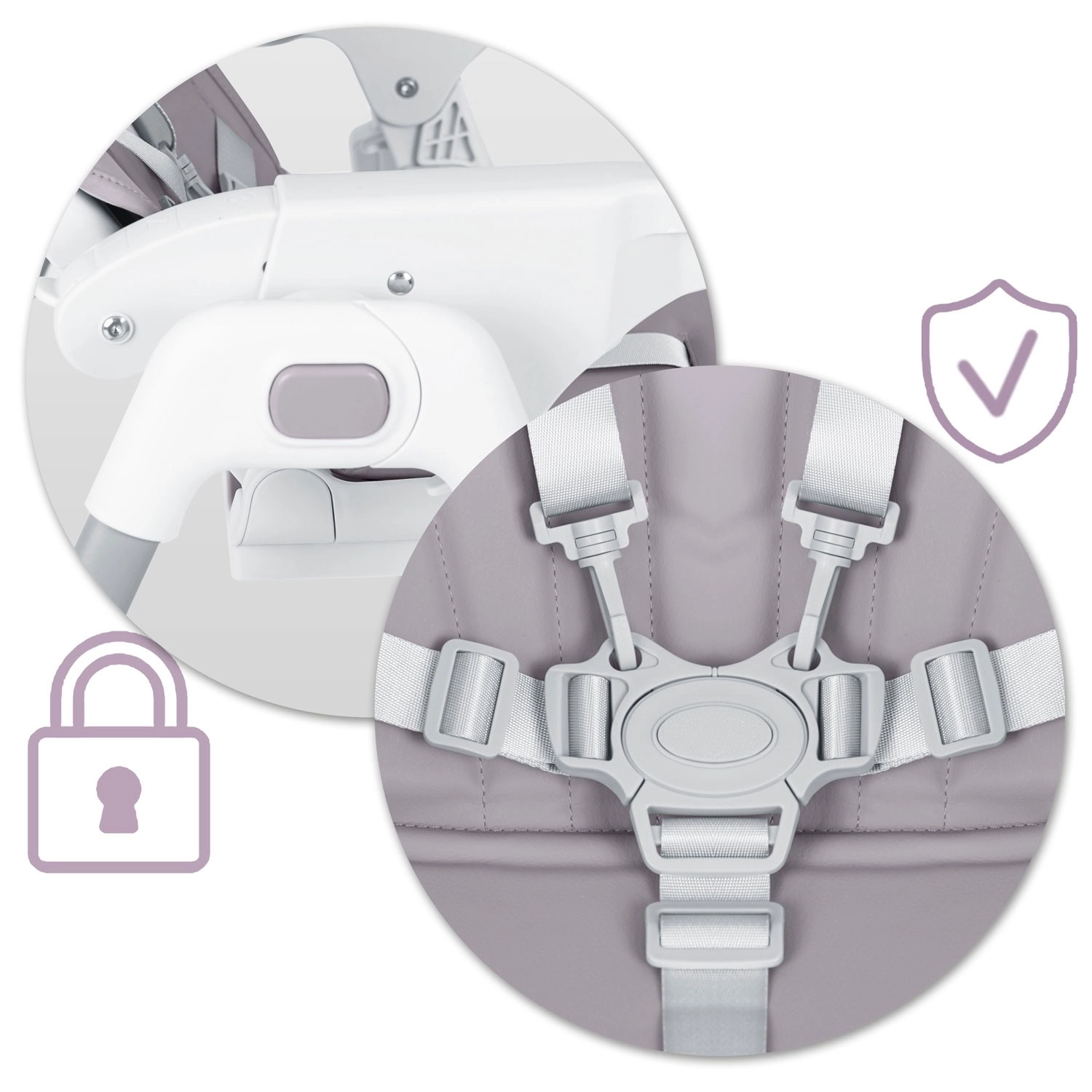 Pettočkovni varnostni pasovi in stabilen okvir zagotavljajo varno sedenje otroka med obroki in igro. Nastavitve in zapore so lahko dostopne in zanesljive.