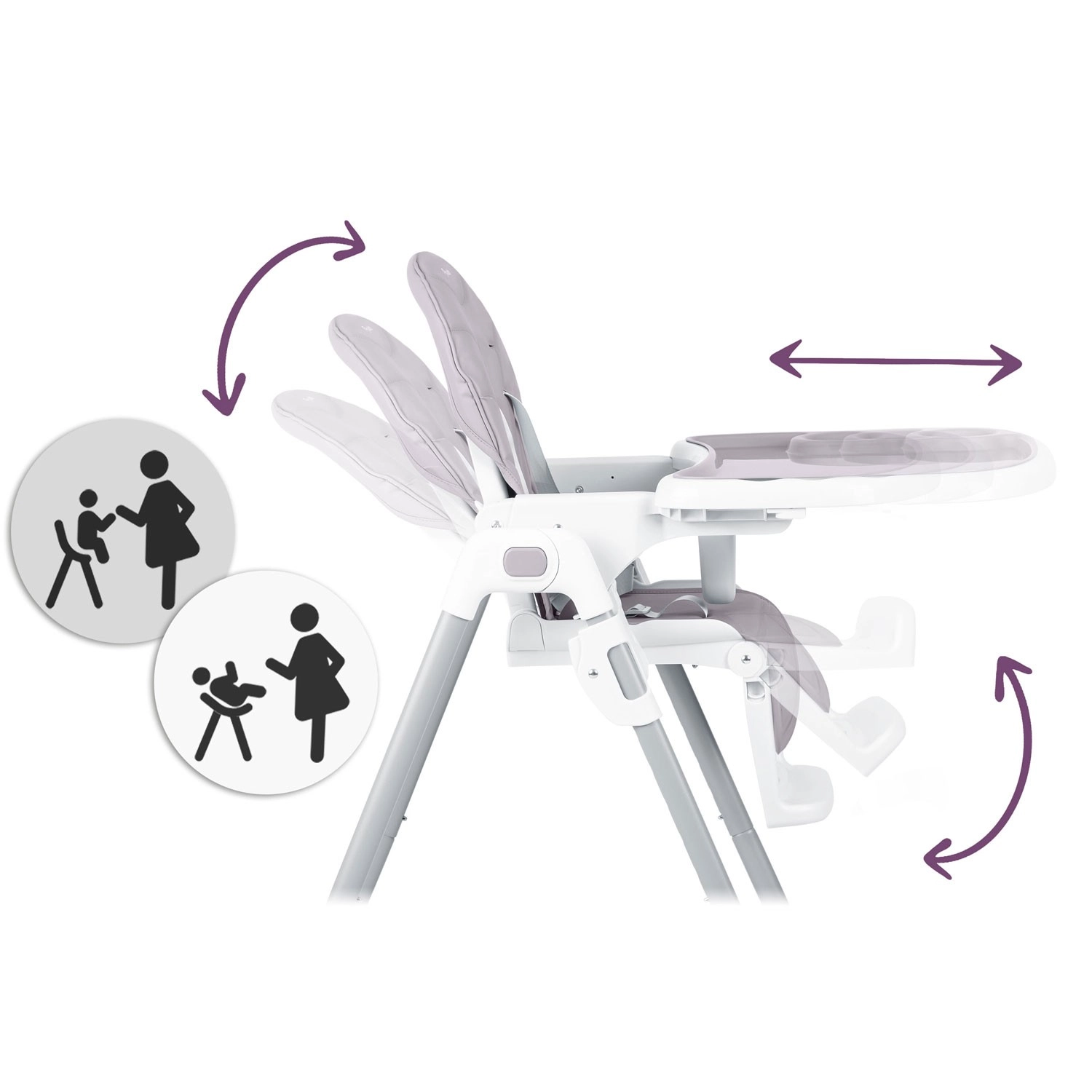- Prilagodljive nastavitve: 3 položaji pladnja, nastavljiva višina sedeža in opora za noge.