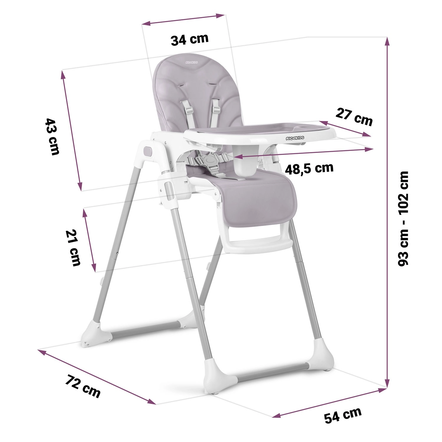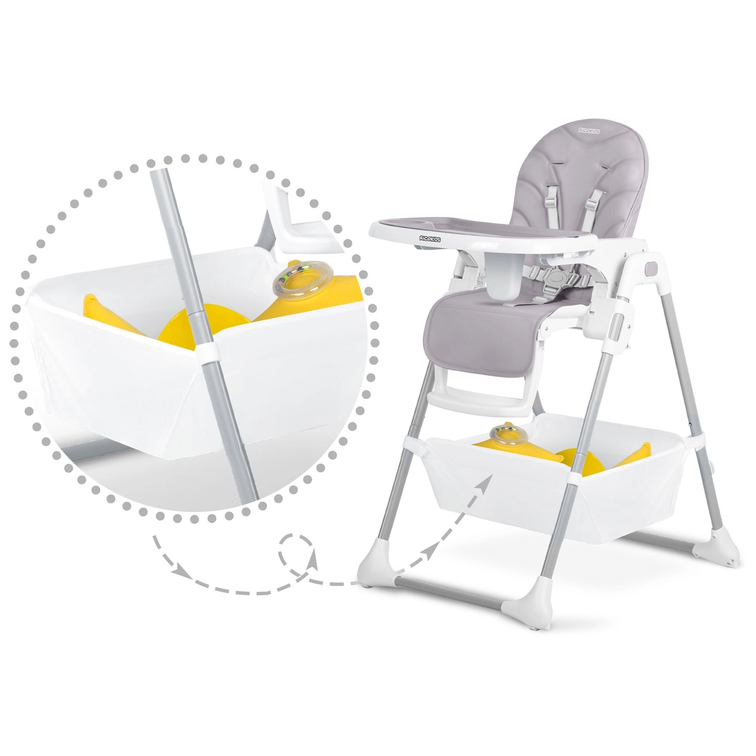 Praktičen in varen jedilni stolček Ricokids Tulo raste z vašim otrokom in olajša vsak obrok. Ponuja nastavljivo višino, nastavljiv in odstranljiv pladenj z vložkom in povišanimi robovi, nastavljivo oporo za noge ter enostavno čiščenje površin. Zahvaljujoč 5-točkovnim varnostnim pasom in stabilni konstrukciji izpolnjuje standard EN 14988. Zadnja kolesca olajšajo premikanje, zložljiva funkcija pa prihrani prostor pri shranjevanju.
