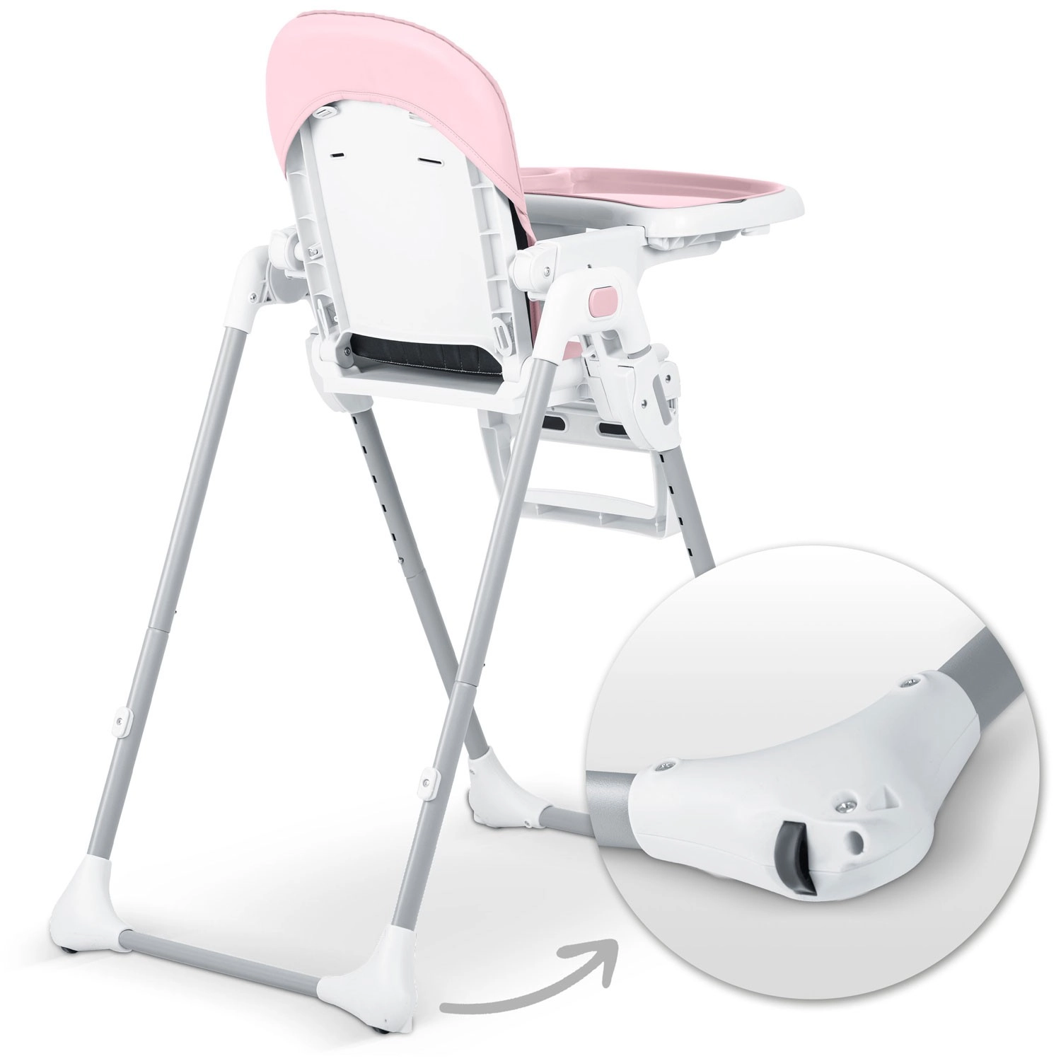 Stolček se hitro zloži v kompaktno obliko za preprosto shranjevanje in ima zadnja kolesca za udobno premikanje. Pettočkovni pasovi in stabilna kovinska konstrukcija s širokimi nogami zagotavljajo visoko varnost ter mir pri hranjenju in igri.