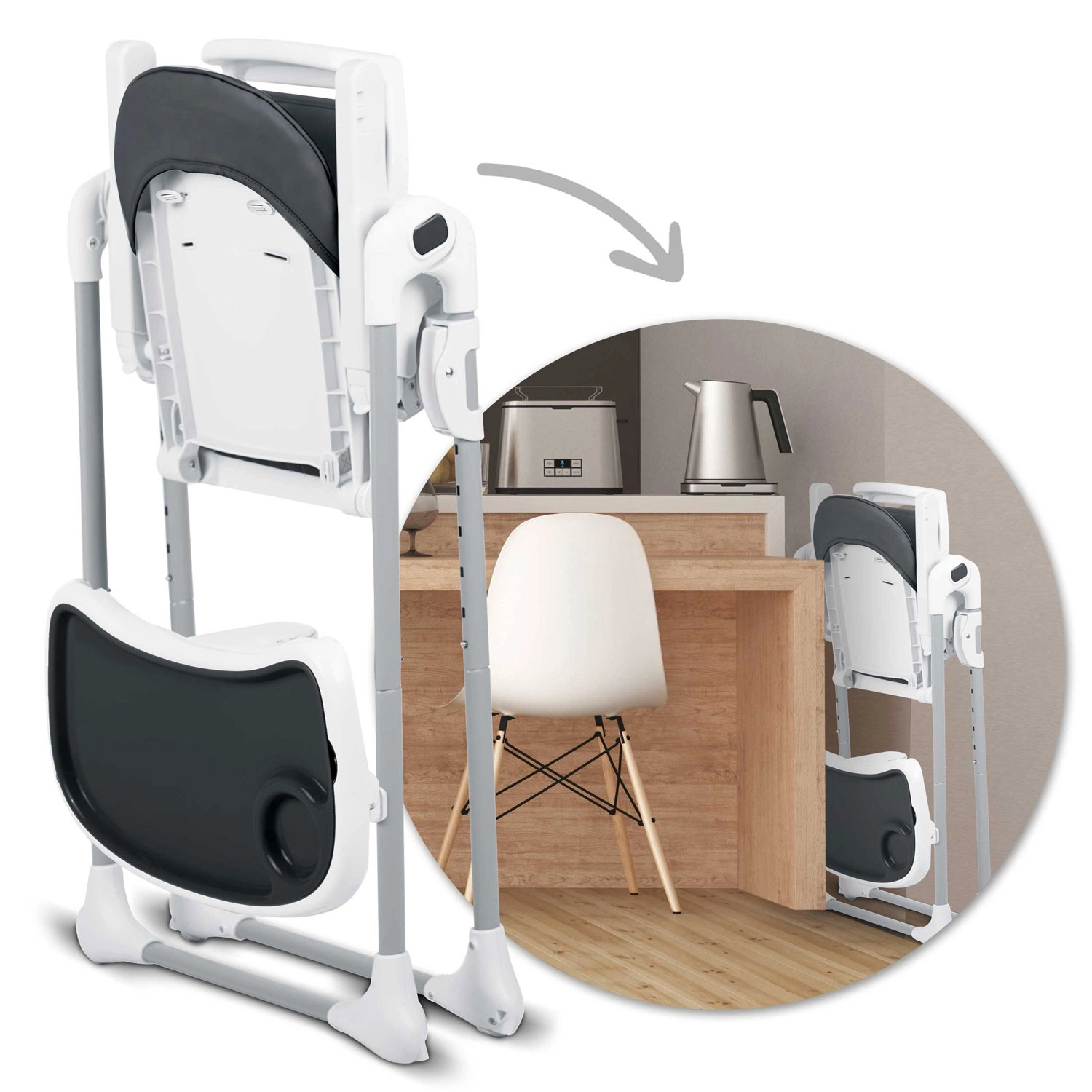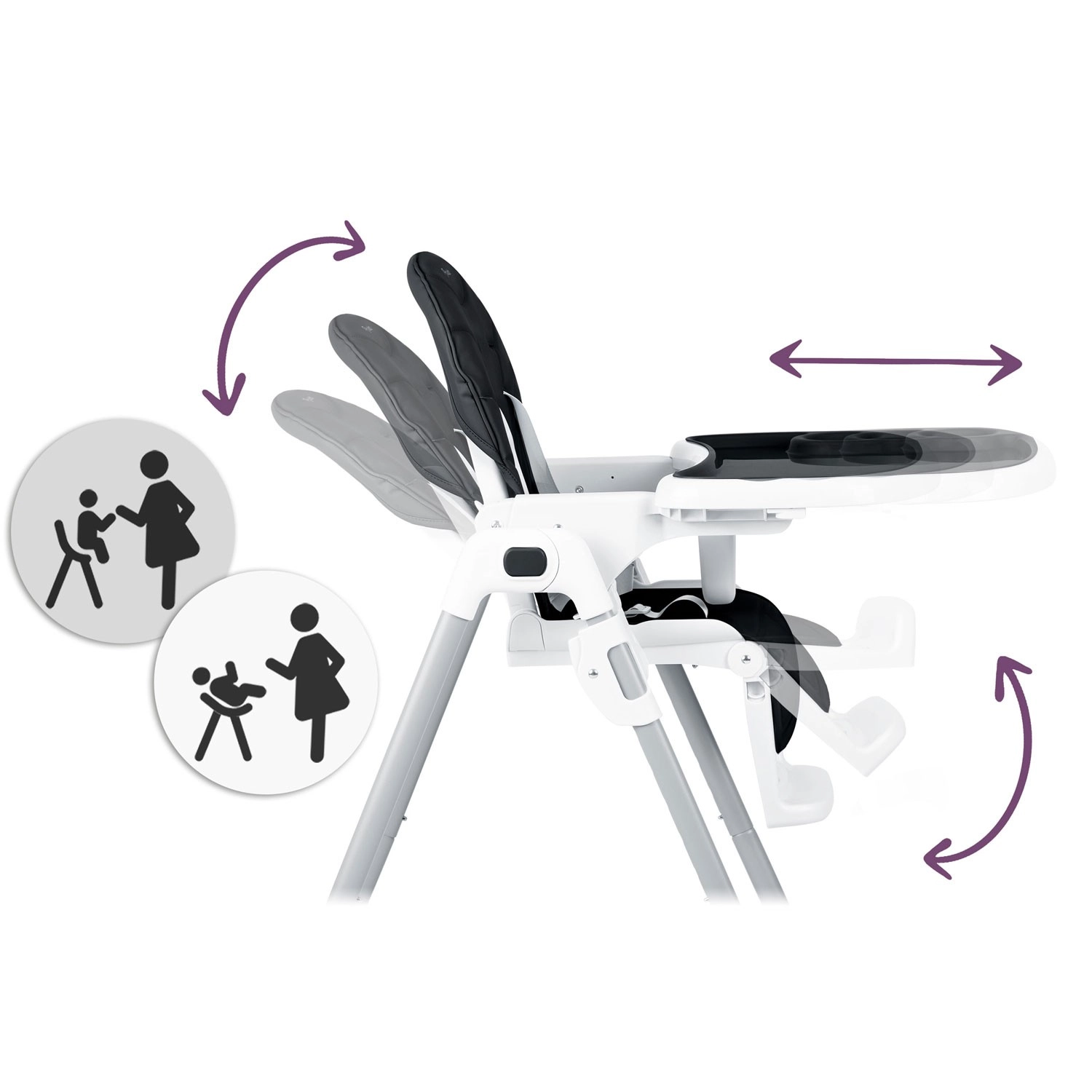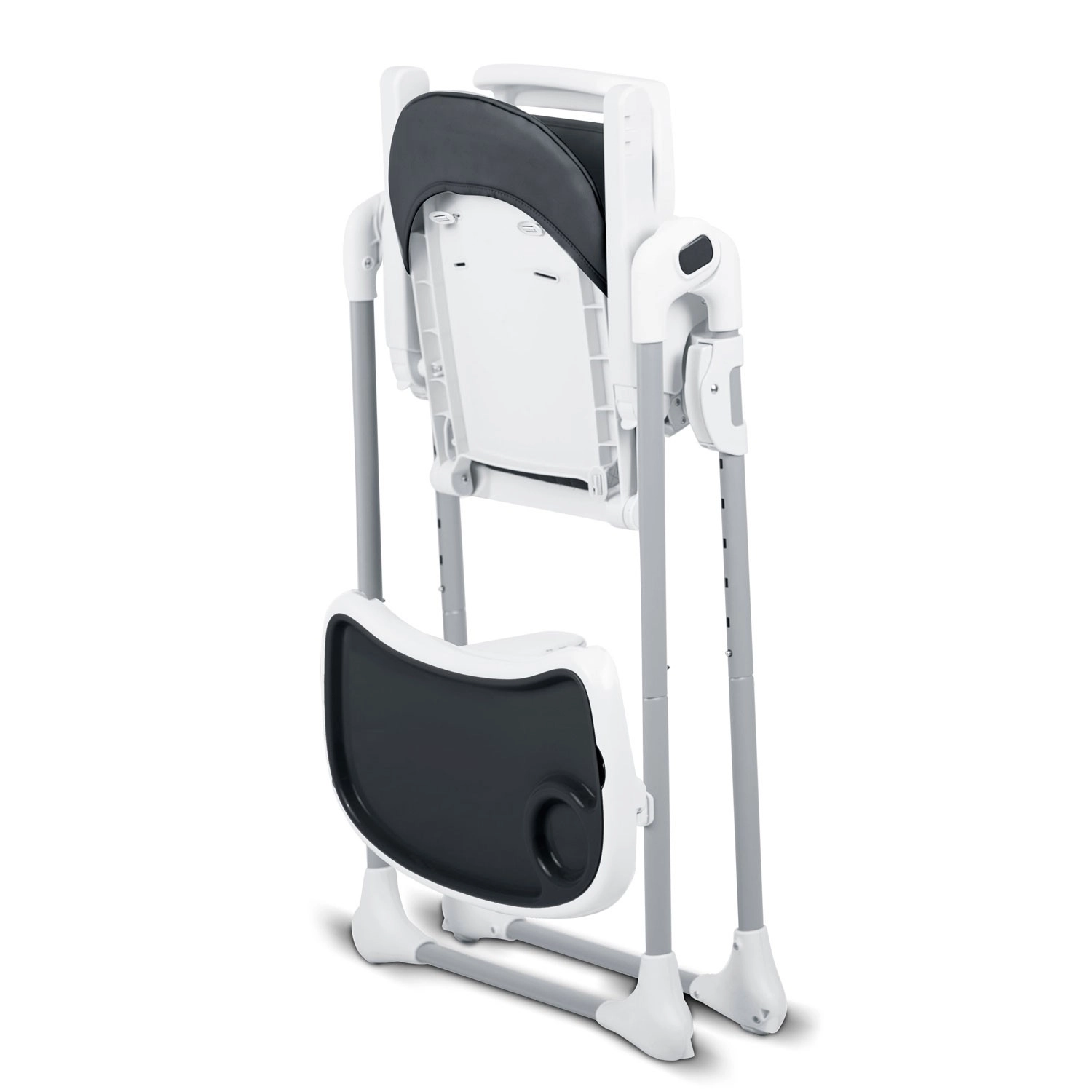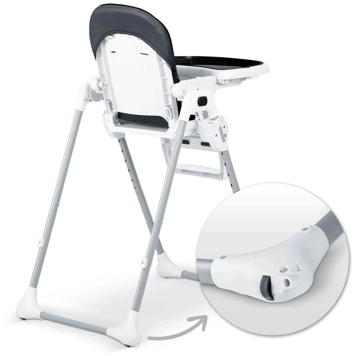 Vzdrževanje je hitro: prevleko iz neumazljivega materiala je dovolj obrisati z vlažno krpo, pladenj z odstranljivo zgornjo vložko pa lahko preprosto odpnite in splaknete pod tekočo vodo. Praktična funkcija hitrega zlaganja prihrani prostor v manjših interierjih, kolesa v zadnjih nogah pa olajšajo premikanje.