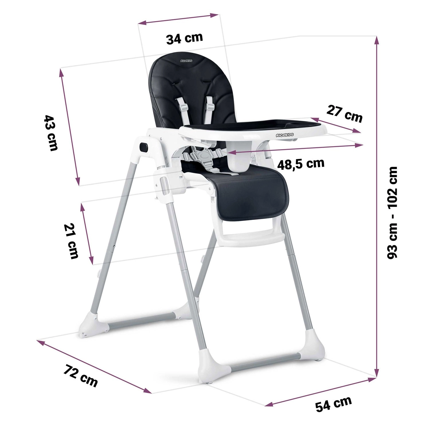 Stolček RICOKIDS Tulo raste skupaj z otrokom, s snemljivim pladnjem pa ga lahko uporabljate tudi za starejšega malčka pri mizi. Stabilna konstrukcija s široko osnovo, 5-točkovni pasovi po standardu EN 14988 in protizdrsni zaključki nog poskrbijo za varno sedenje pri hranjenju in igri.