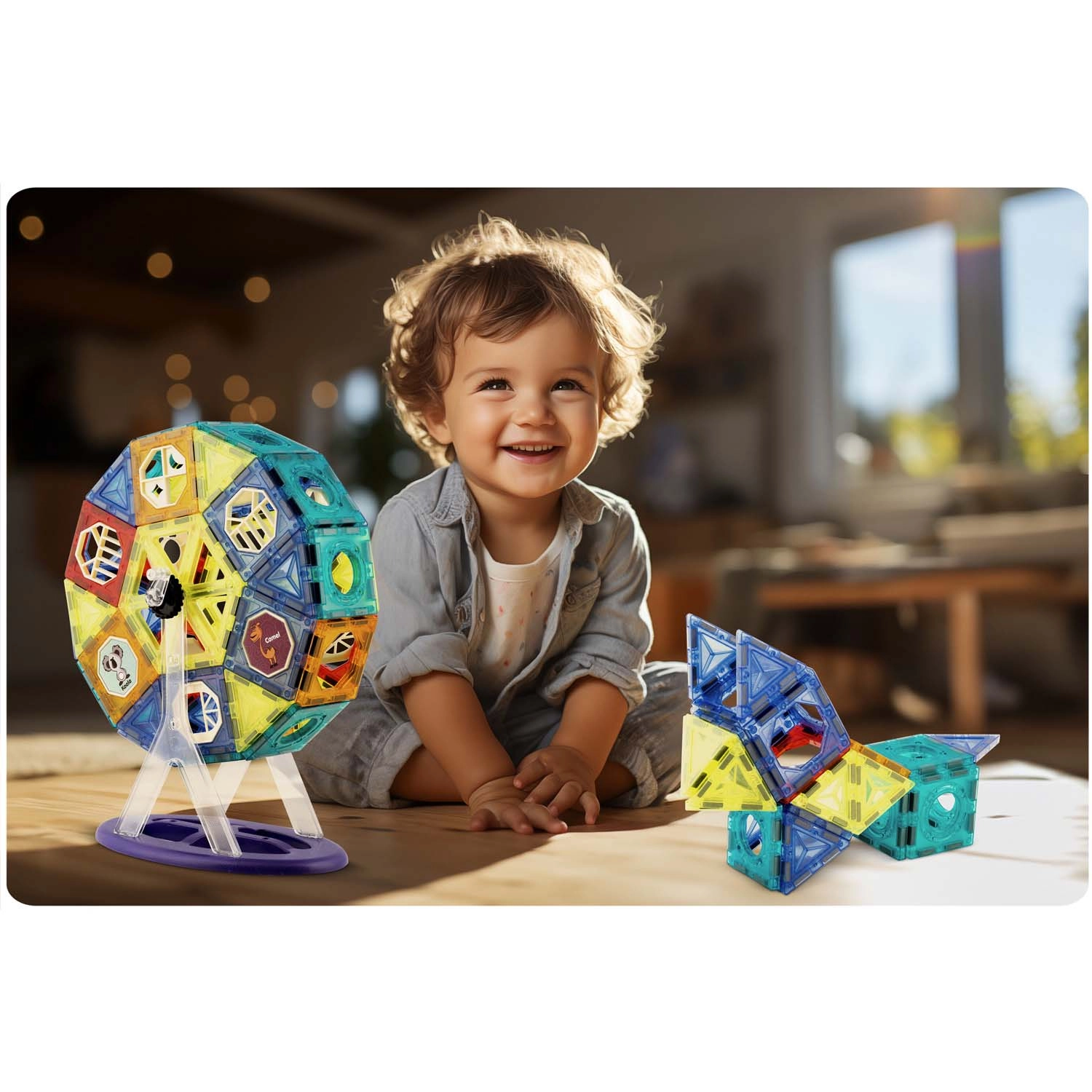 Odkrijte ustvarjalni svet magnetnih sestavljank RICOKIDS z vrtečim se kolesom! Ta razširjeni komplet ponuja več kot 70 kosov, prosojne barvne oblike in premikajoče se Ferrisovo kolo na stabilni osnovi. Otroci urijo fino motoriko, koordinacijo oko–roka in prostorsko predstavljivost, medtem ko gradijo neskončne kombinacije. Priložene so figurice, nalepke in čudovito darilno pakiranje. Varna in certificirana zabavna učna igra za male konstruktorje.