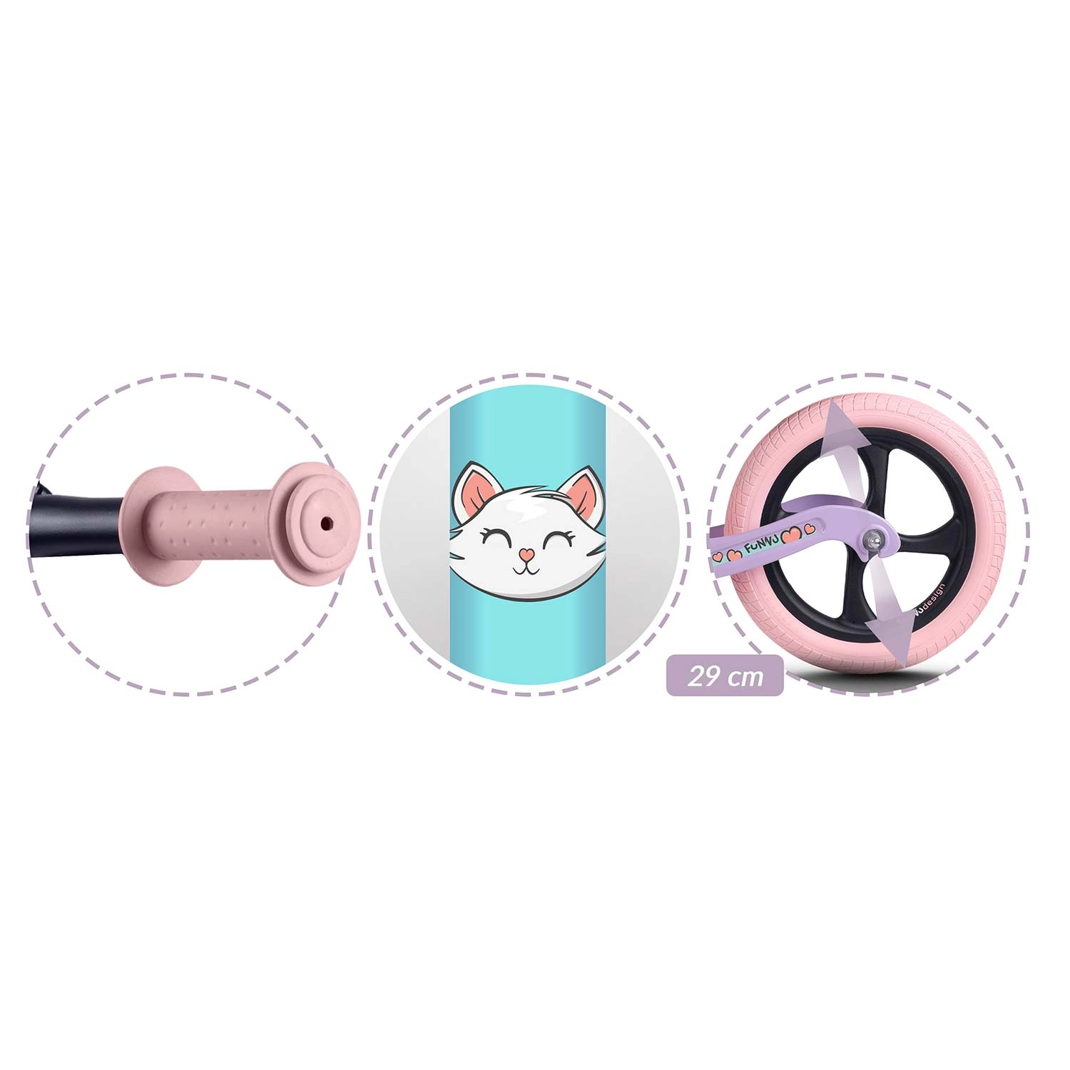 Ergonomski mehki penasti sedež z neprekinjeno regulacijo višine (pribl. 35–42 cm) raste z otrokom in zagotavlja udobje pri vsaki vožnji. Gumijasti ročaji z omejevalniki nudijo zanesljiv oprijem in nadzor nad krmiljenjem, medtem ko široko krmilo in stabilna medosna razdalja podpirata naravno učenje ravnotežja.