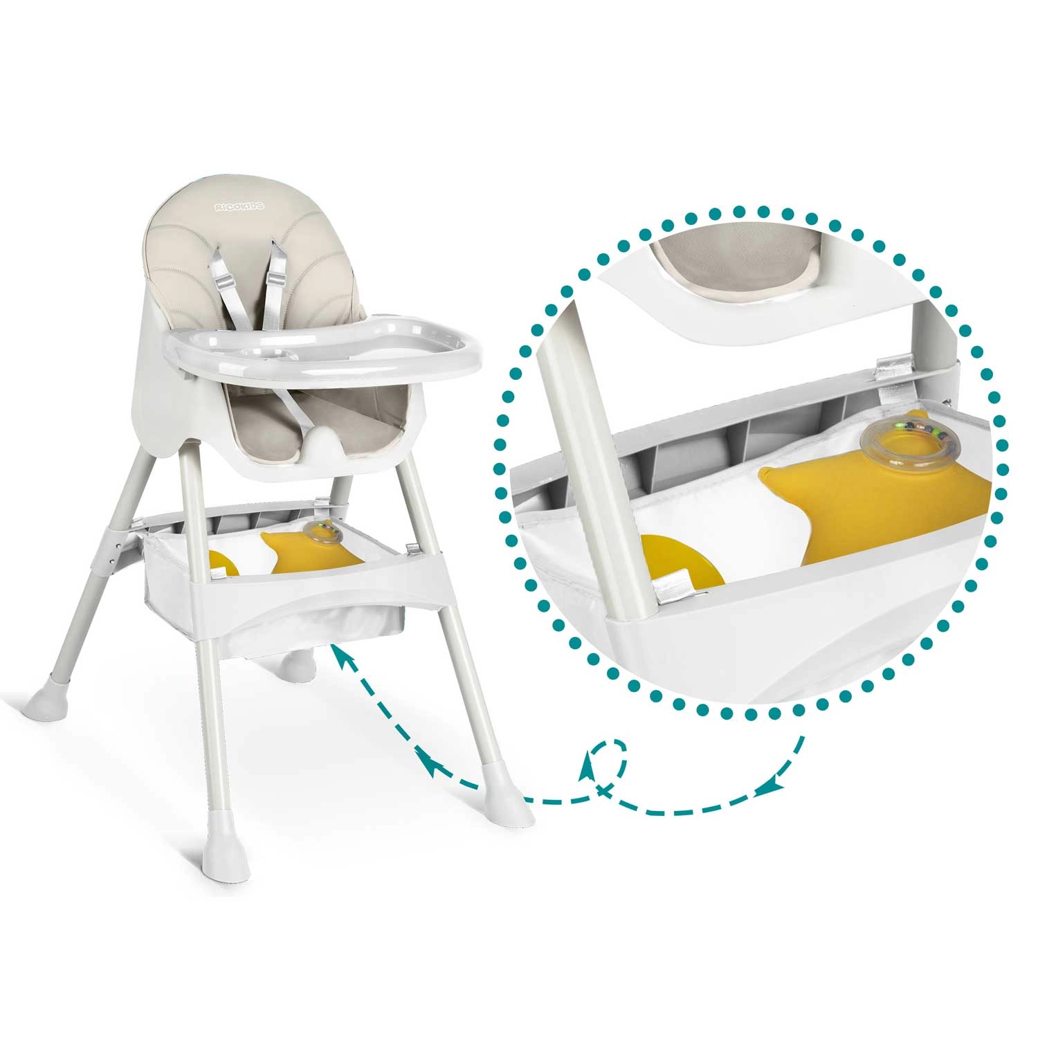 Stilski in praktični otroški stolček za hranjenje 3v1 RICOKIDS Milo raste z vašim otrokom – od visokega stolčka do nizkega stola. Ponuja odstranljivo in nastavljivo mizico z zvišanimi robovi, preprosto čiščenje zahvaljujoč pralnim materialom ter 5-točkovni varnostni pas. Za stabilnost skrbijo nedrseče nogice, v paketu pa boste našli tudi praktičen silikonski slinček in shranjevalno košaro.