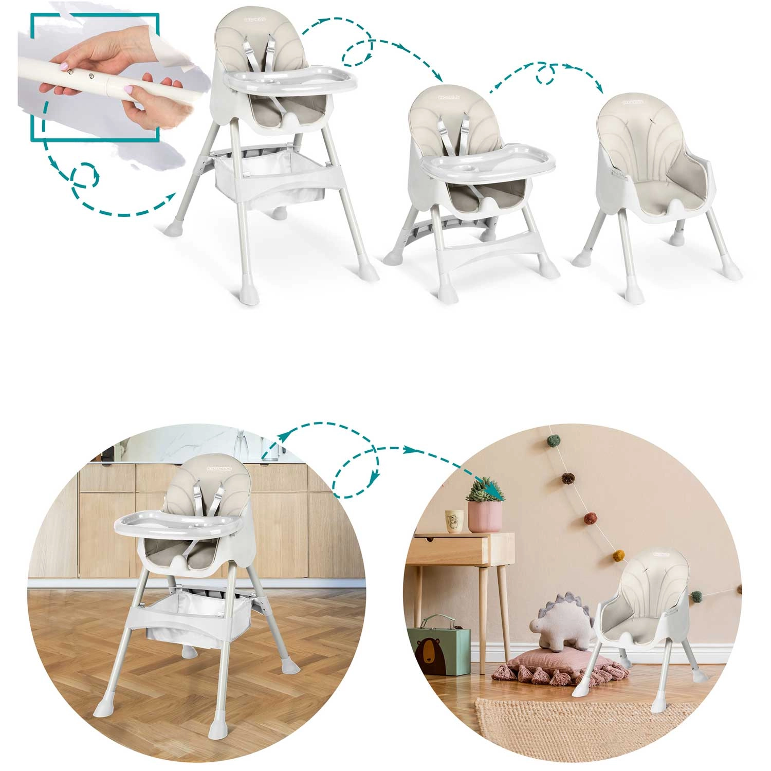 Varnost je na prvem mestu: 5-točkovni pasovi, nedrseči zaključki nog in konstrukcija, skladna z evropskim standardom EN 14988, zagotavljajo zanesljivost pri hranjenju in igri. Mehko oblazinjenje je iz materiala, ki ne vpija nečistoč – dovolj je, da ga obrišete z vlažno krpo. Del kompleta sta tudi shranjevalna košara za igrače in potrebščine ter silikonski slinček gratis.