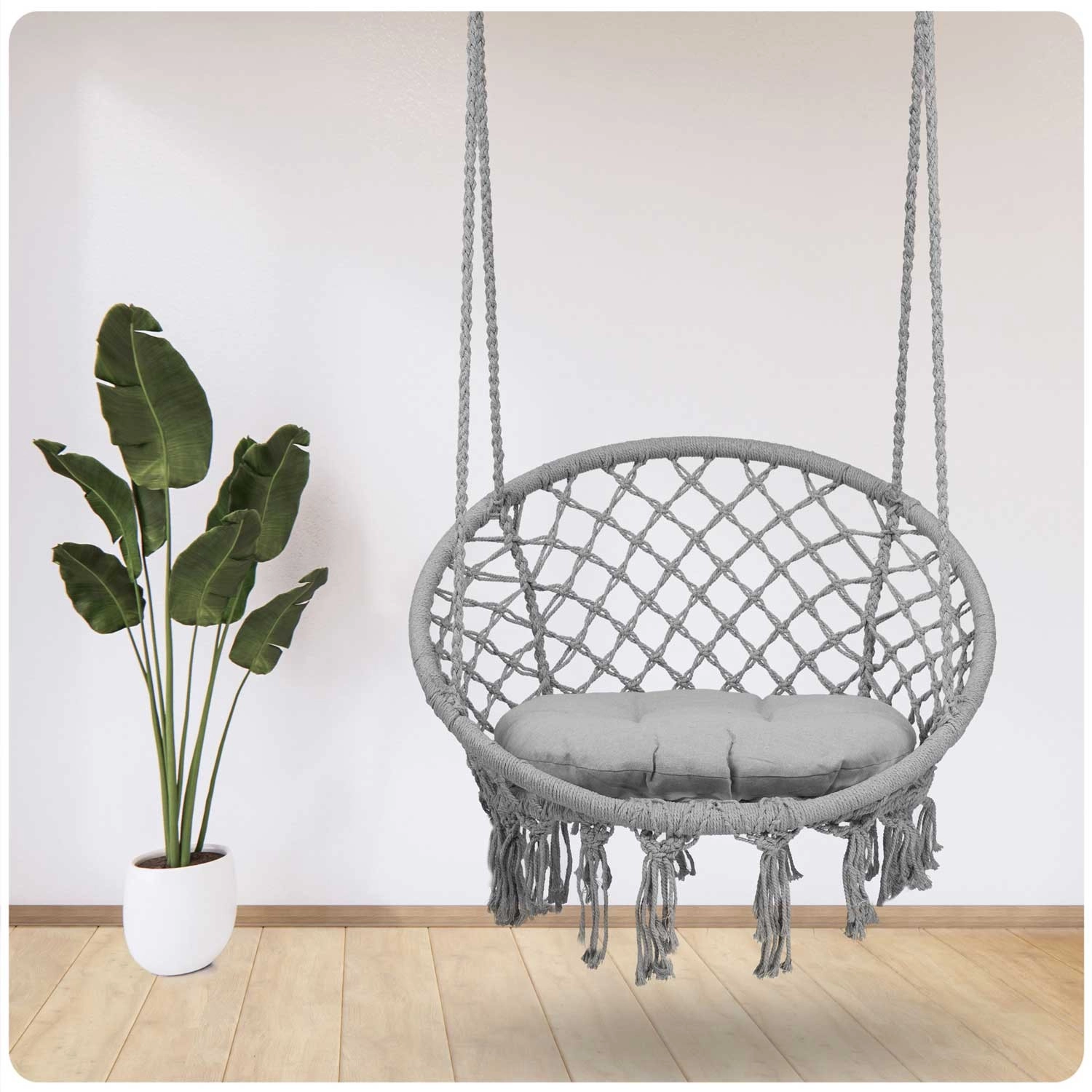 Uživajte v počivanju v visečem stolu v boho slogu s širokim sedalom, visokim naslonjalom in mehko blazino, vključeno v ceno. Trpežna kovinska konstrukcija, močno makramejevo prepletanje in dvojne viseče vrvi zagotavljajo varno guganje doma in na prostem. Nosilnost do 150 kg in možnost montaže na eno ali dve pritrdilni točki naredita ta stol idealno izbiro za balkon, teraso in dnevno sobo.