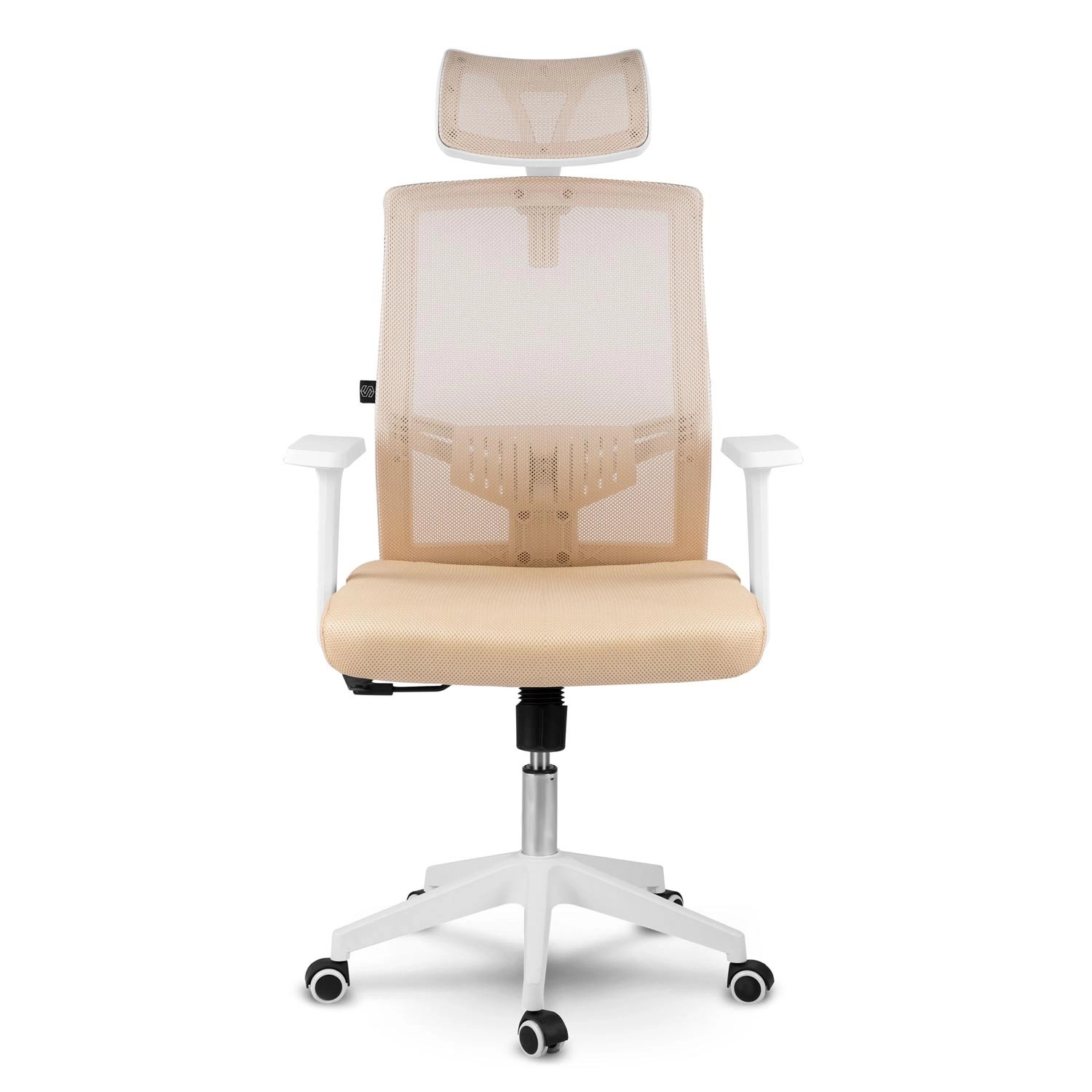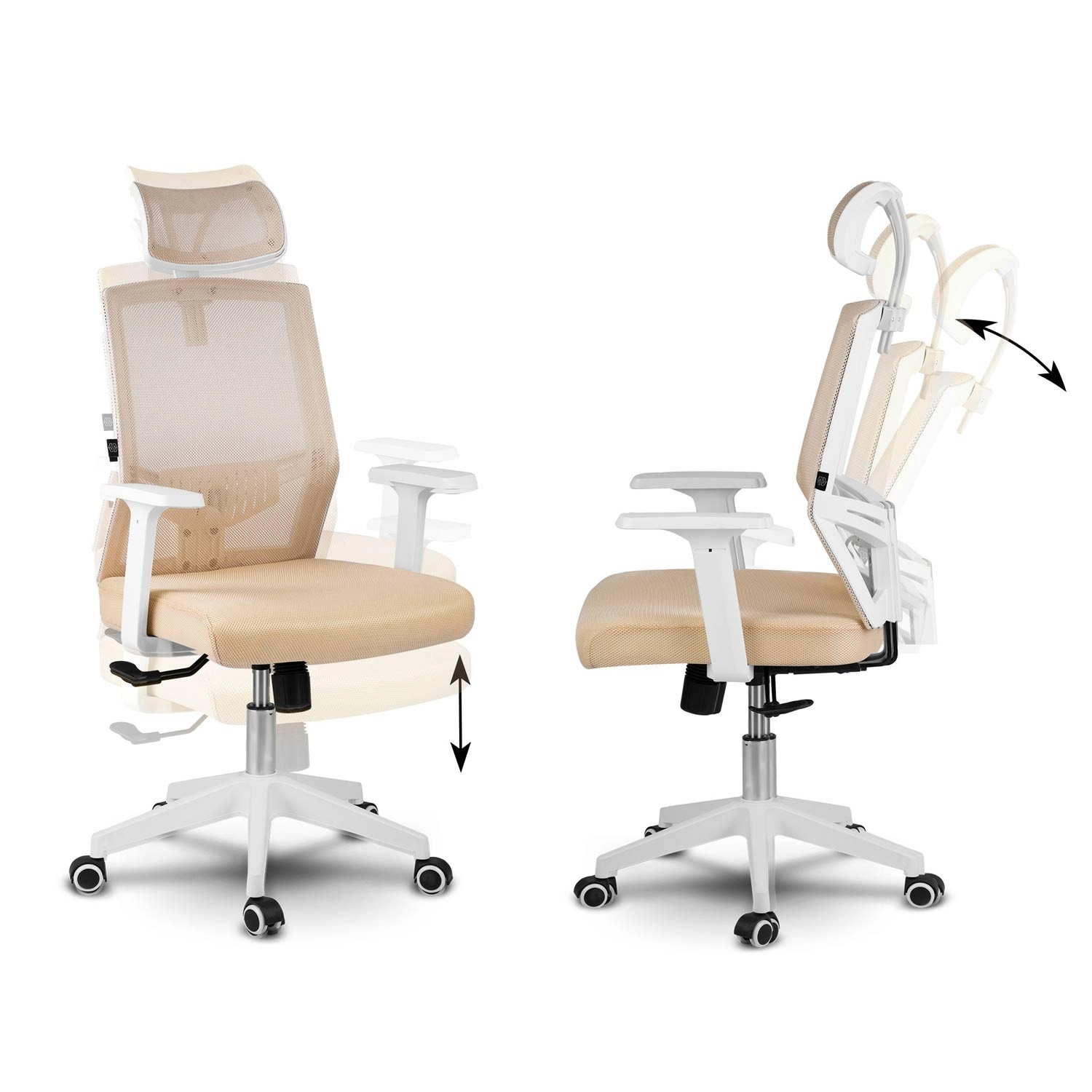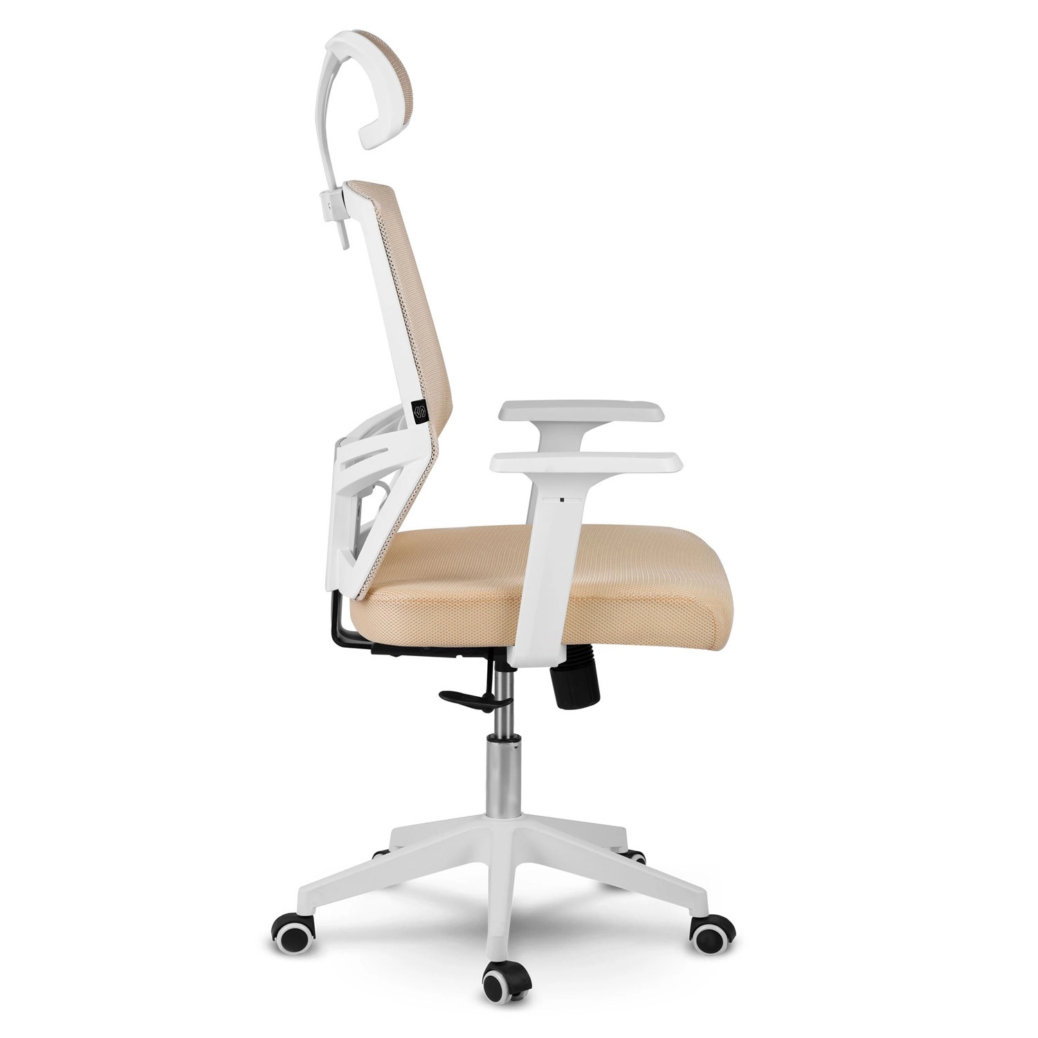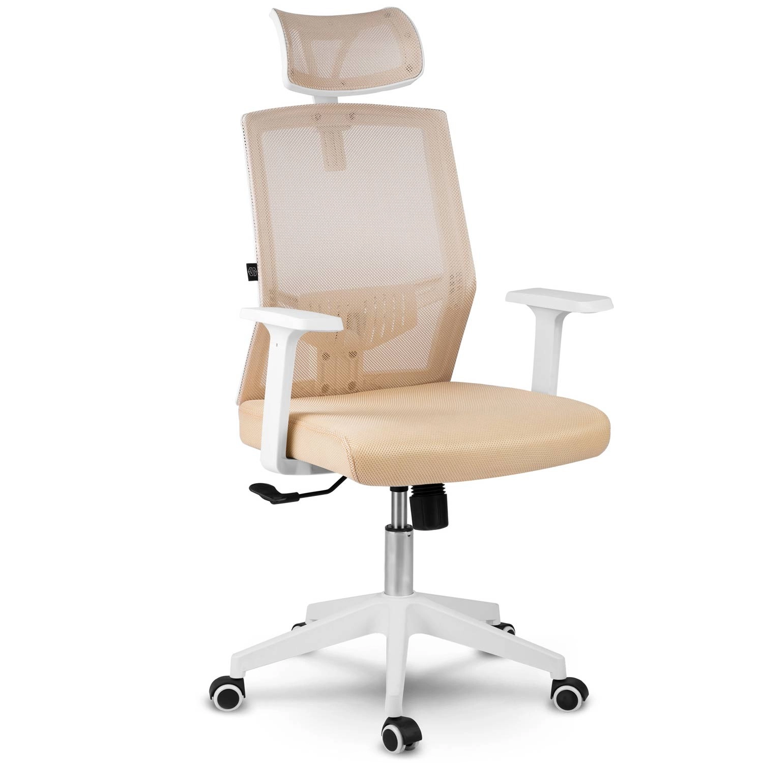 Slogoven in udoben pisarniški stol Sofotel Rotar v bež barvi združuje zračno mikromrežico, ergonomsko oblikovanje z ledveno oporo in nastavljiv vzglavnik. Ponuja tekoče nastavljanje višine, gugalni mehanizem z možnostjo blokade ter tihi gumirani koleščki, ki ne opraskajo tal.