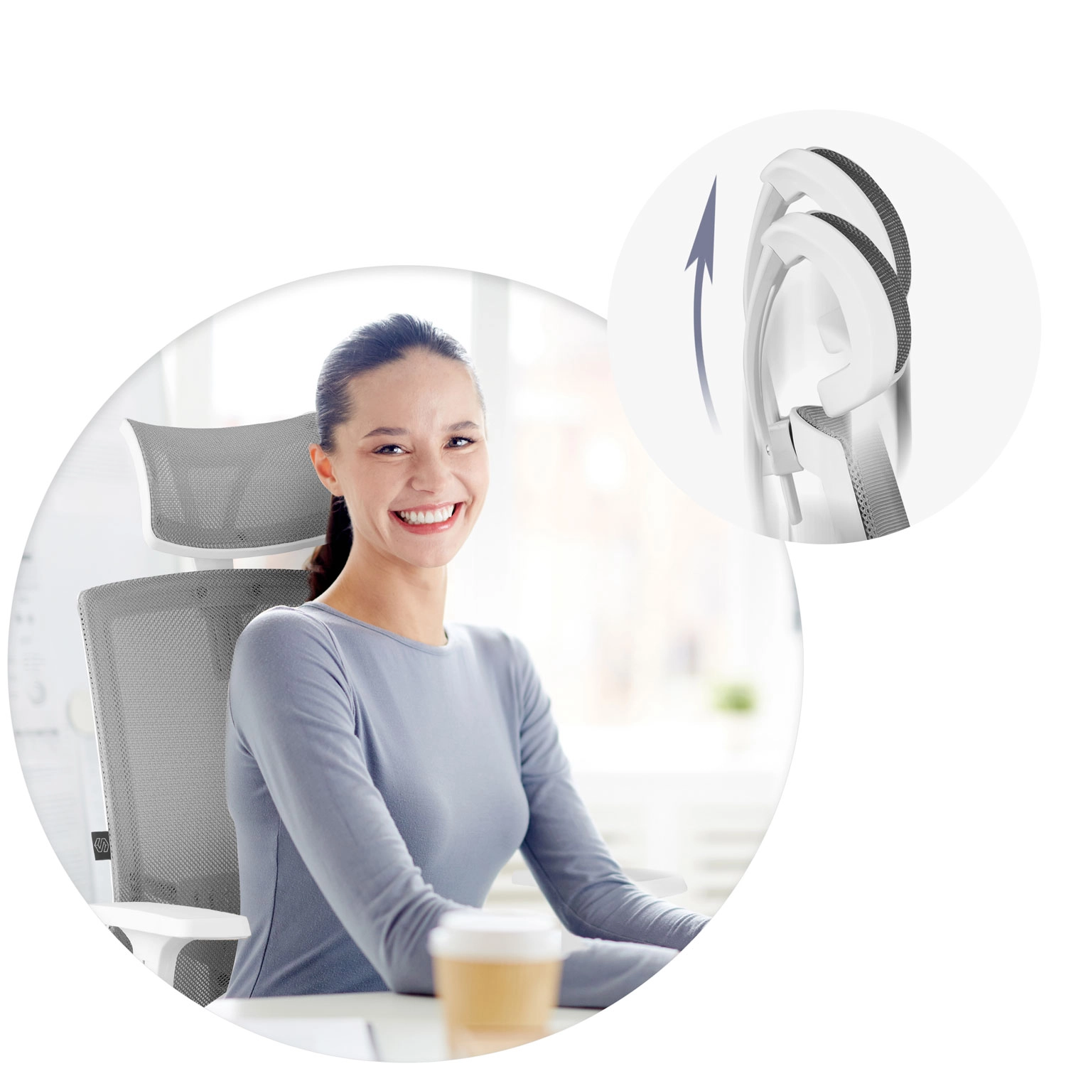 Preprosto prilagodite položaj in višino vzglavnika, da razbremenite vratno hrbtenico in povečate udobje pri delu ali počitku.