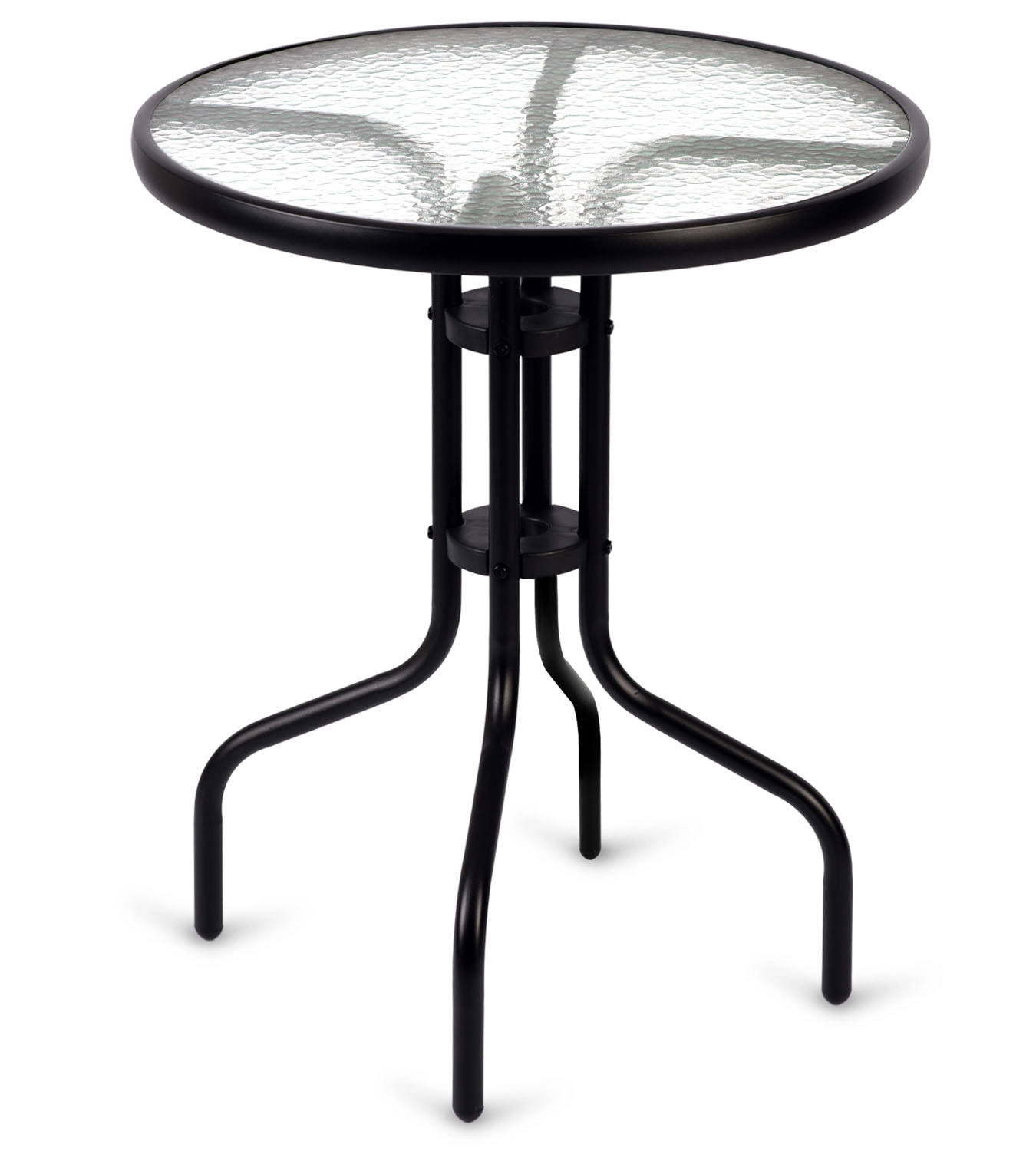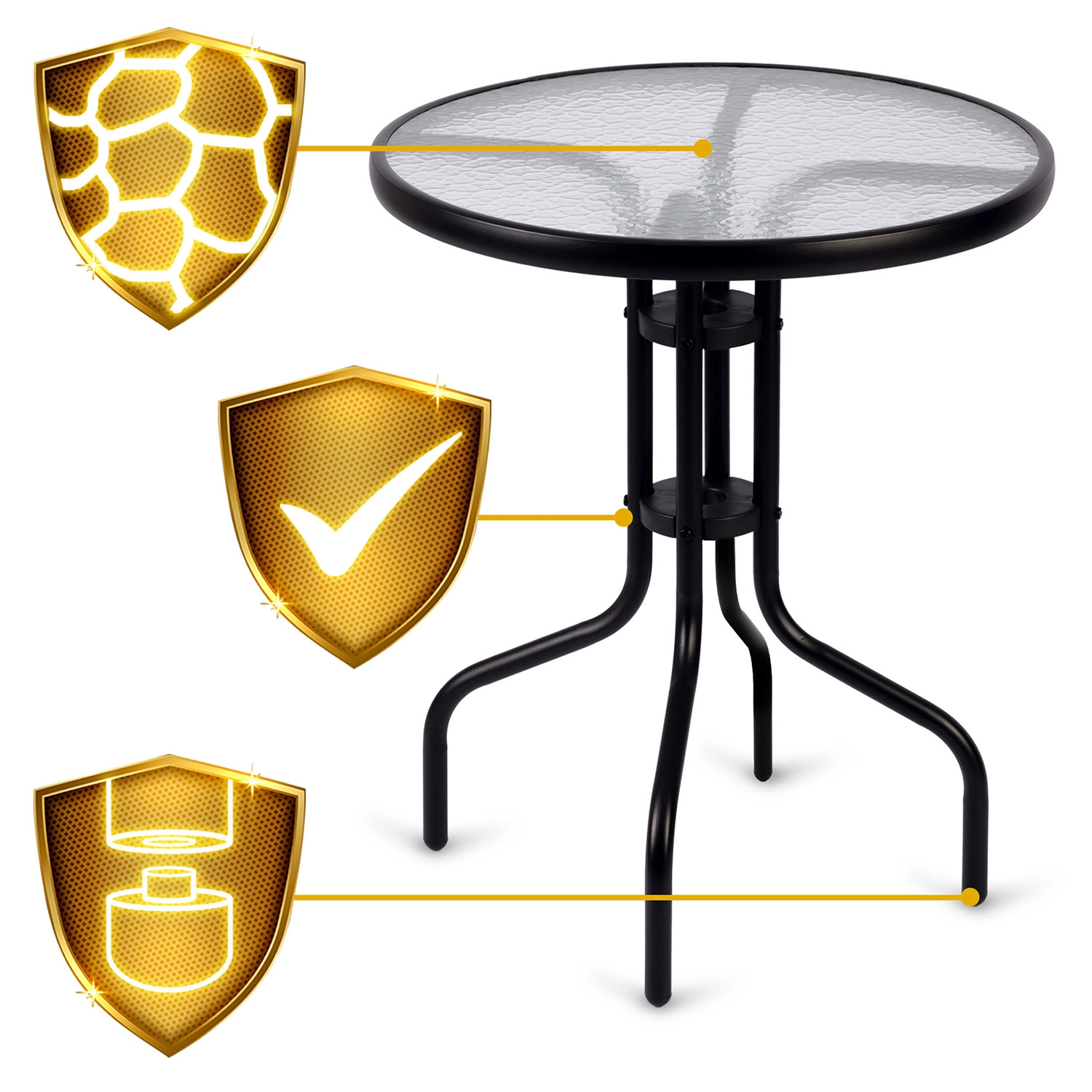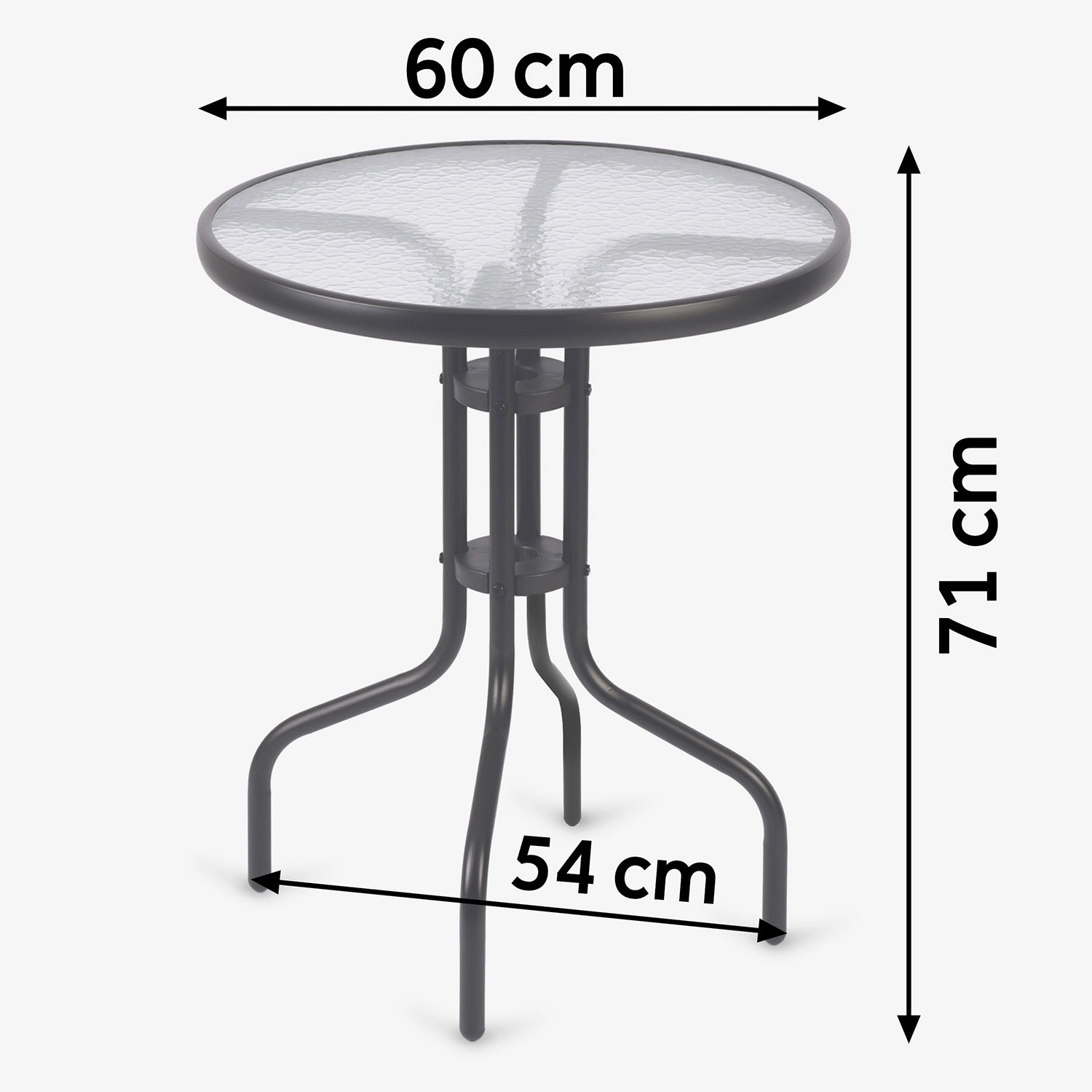 Elegantna okrogla vrtna miza SOFOTEL s premerom 60 cm in višino 71 cm združuje vzdržljivo jekleno konstrukcijo s kaljenim steklom z rustikalno teksturo. Zahvaljujoč prašno lakiranemu okvirju je zaščitena pred korozijo, nudi stabilnost in je primerna za celoletno uporabo na vrtu, terasi in balkonu. Enostavna za čiščenje, odporna proti praskam in prenese do 30 kg.