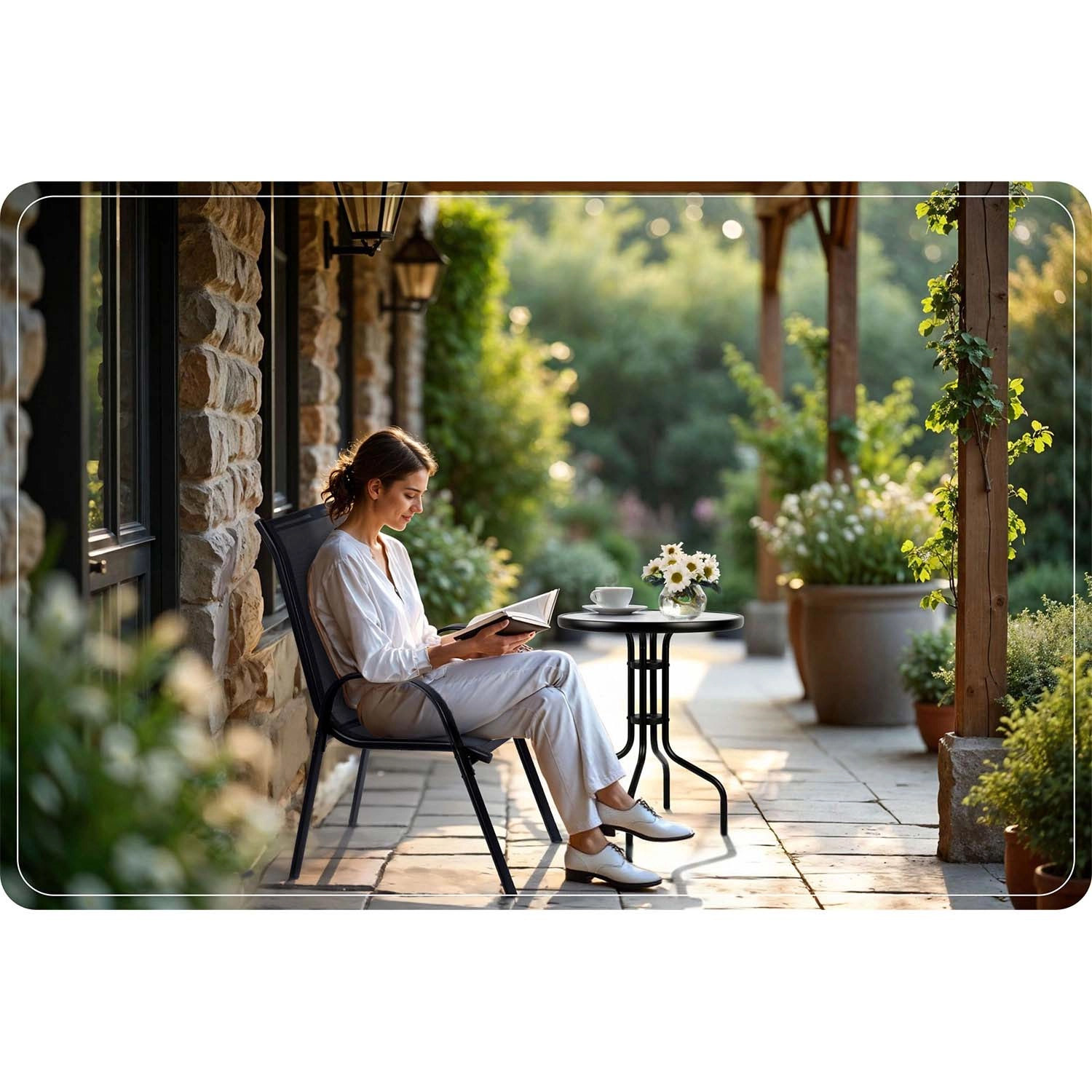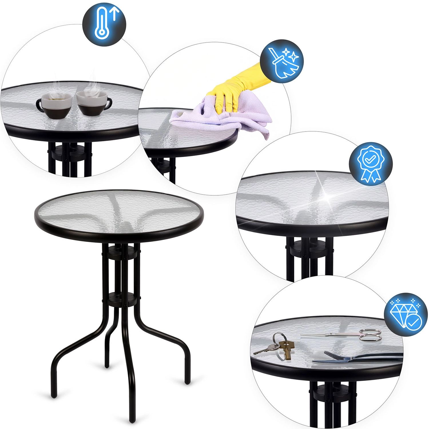 Miza je idealna za kavo, pijače ali dekoracije, kompaktne mere pa omogočajo postavitev tudi na manjših balkonih. Zaobljeni robovi povečujejo varnost pri vsakodnevni rabi, enostavno vzdrževanje pa prihrani čas – dovolj je vlažna krpa.