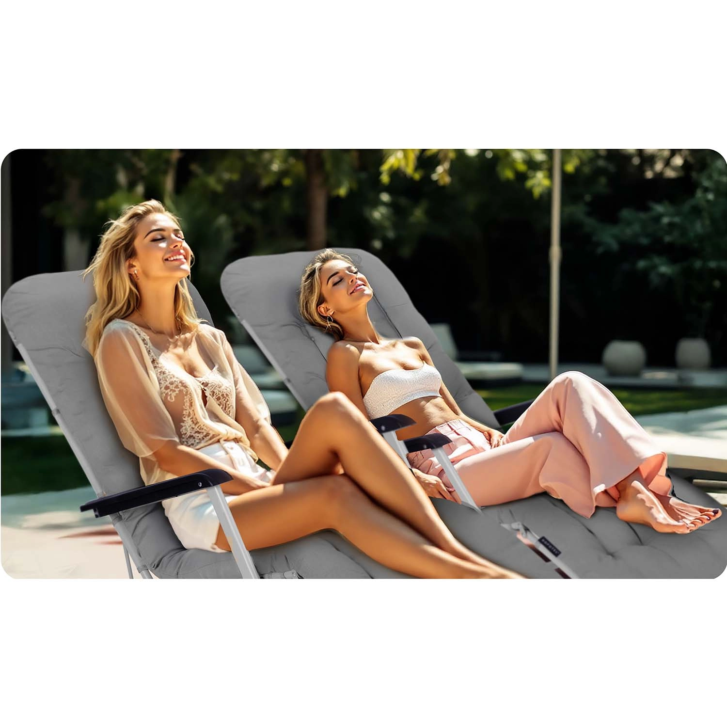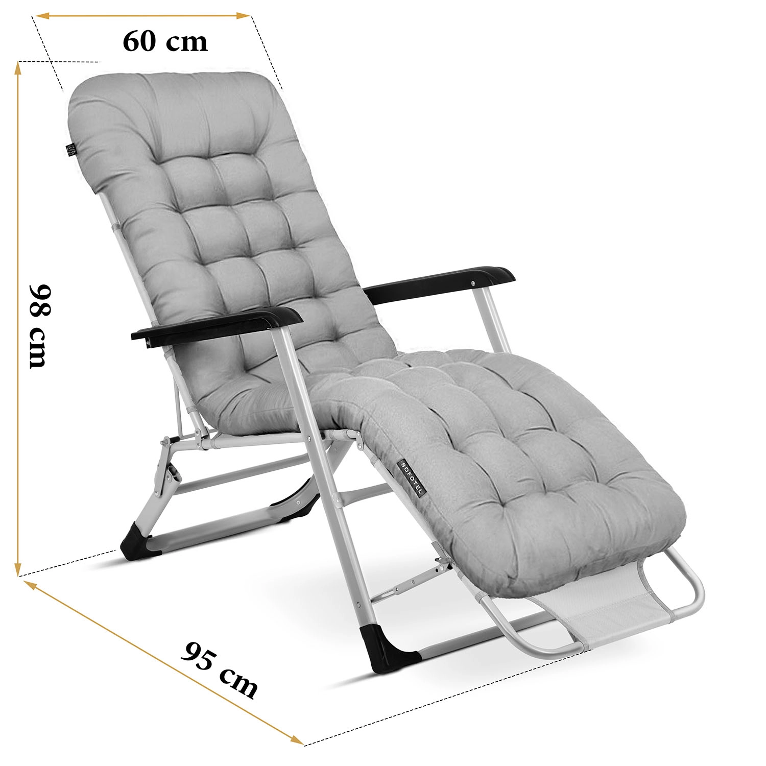Robustna zložljiva konstrukcija je izdelana iz odpornih materialov, ki se enostavno čistijo, se ne deformirajo in so odporni na UV-sevanje. Praktični plastični naslonjali za roke povečujeta udobje, protizdrsne kapice na nogah zagotavljajo stabilnost na različnih podlagah, siva barva oblazinjenja pa se poda vsakemu eksterierju.