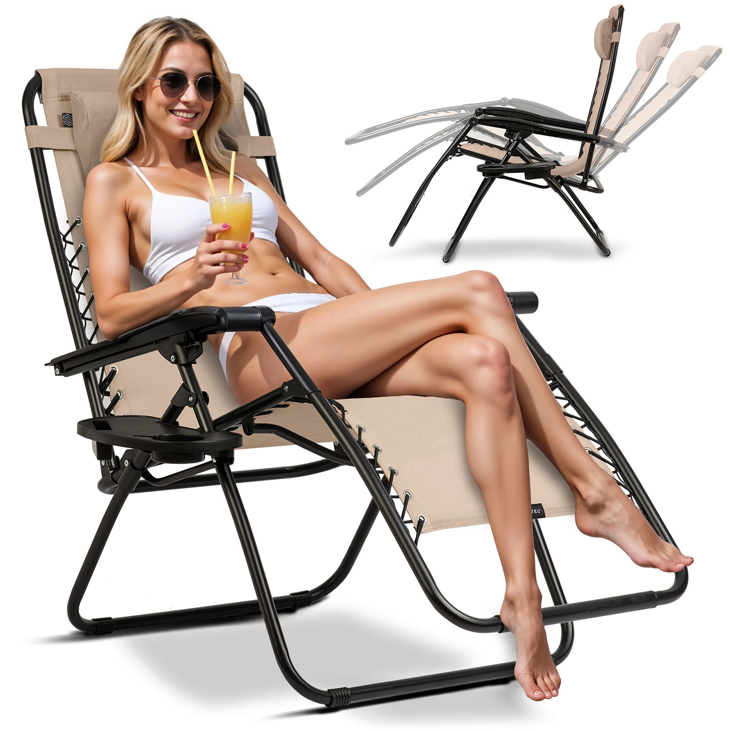 Praktična stranska mizica z držali za pijačo in telefon poskrbi, da imate vse potrebno pri roki. Lahka, a čvrsta konstrukcija se zlahka zloži in v zloženem stanju zavzame malo prostora – idealno za balkon, teraso, vrt, ob bazenu in za kampiranje.