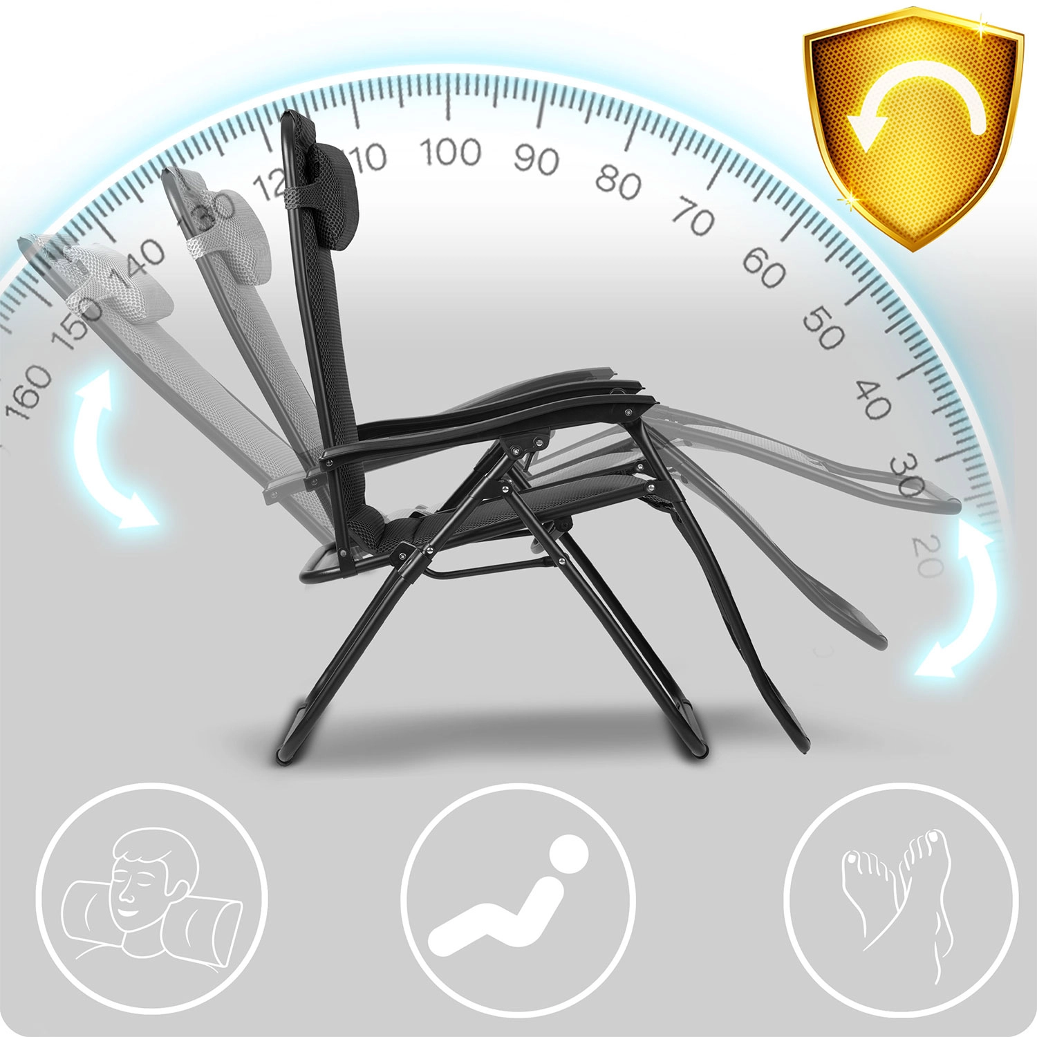Z tekočim zaklepanjem položaja zlahka nastavite kot sedenja ali ležanja natančno po svojem razpoloženju. Nastavljiva podglavnica nudi podporo točno tam, kjer jo potrebujete. Vzdržljiva jeklena konstrukcija s prašnim premazom je stabilna, trpežna in pripravljena na pogosto zunanjo uporabo.