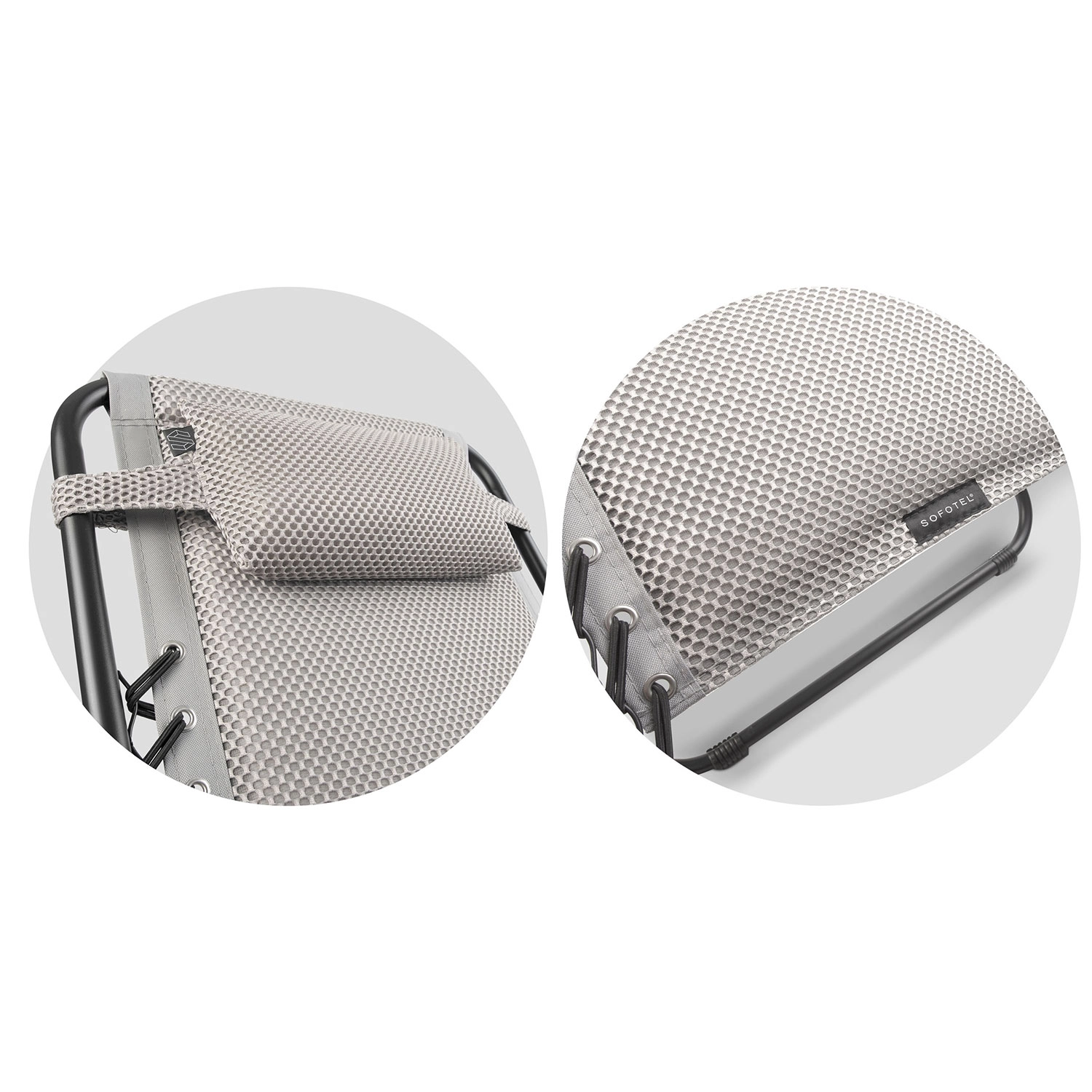 Uživajte v popolnem počitku na svežem zraku z zložljivim ležalnikom SOFOTEL ChillWell Soft. Zahvaljujoč ergonomski zasnovi, tekoče nastavljivemu naslonjalu za hrbet in udobnemu vzglavniku za glavo in vrat ponuja maksimalno sprostitev. Inovativna tkanina 3D FoamGrid™ je mehka, zračna in hitro sušeča, medtem ko vzdržljiv jeklen okvir s prašnim lakiranjem zagotavlja stabilnost in dolgo življenjsko dobo. Idealno za teraso, balkon, vrt in kampiranje.
