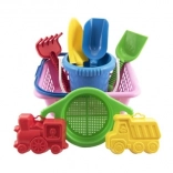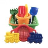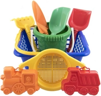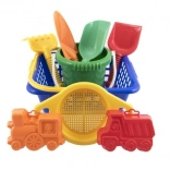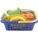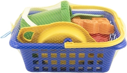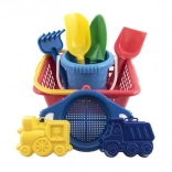 Igriv otroški komplet za pesek s praktično košarico vsebuje vse potrebno za zabavo na plaži in v peskovniku: vedro, lopatico, lopato, grabljice, sito in 2 modelčka. Komplet je iz lahke in trpežne plastike, primeren za otroke od 12 mesecev ter spodbuja fino motoriko in domišljijo.