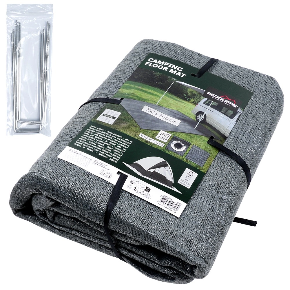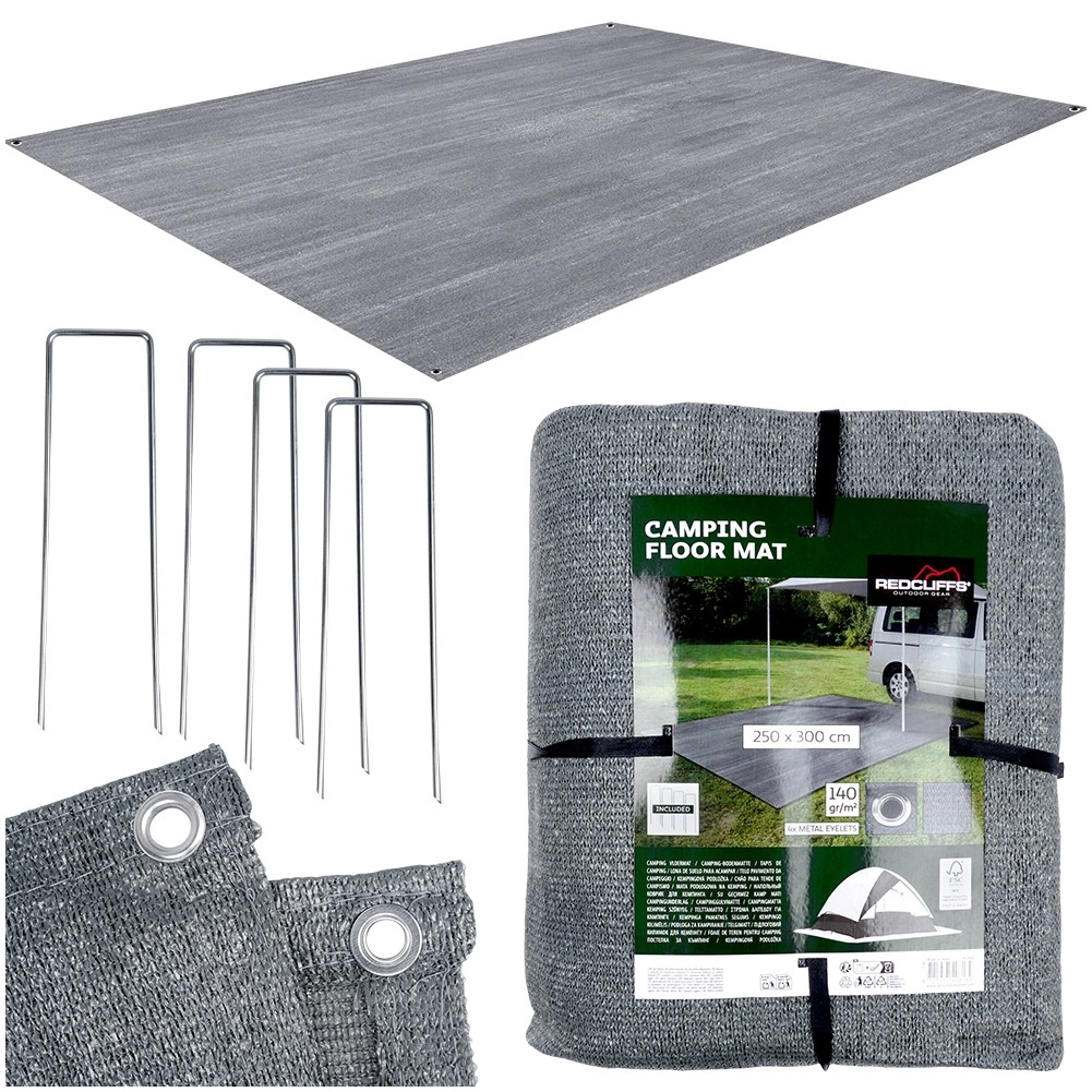 Praktična talna podloga za šotor in predprostor z merami 250 × 300 cm zagotovi pri kampiranju čistočo, suhost in večje udobje. Izdelana je iz odpornega in enostavno pralnega mrežastega blaga v sivi barvi, ima kovinska očesa za pritrditev, v paketu pa najdete tudi 4 kline za stabilno pritrjevanje. Primerna tudi pod tendo avtodoma, za paviljon, na plažo ali piknik.