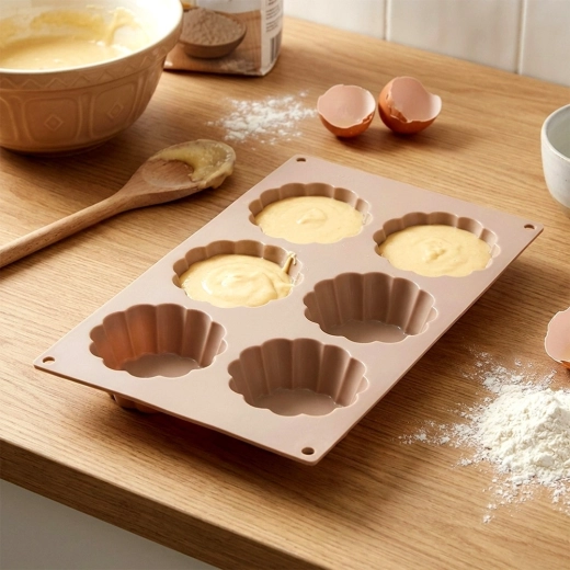 Ta bež silikonski pekač s 6 cvetličnimi oblikami je idealen za vsakodnevno peko in praznične sladice. Dimenzije pekača 30 × 17,5 × 3 cm in velikost ene vdolbine 7,5 × 3 cm so popolne za porcije “ravno prav”. Silikon je lahek, prožen in dobro prevaja toploto, zato se pecivo enakomerno zapeče brez potrebe po namastitvi.