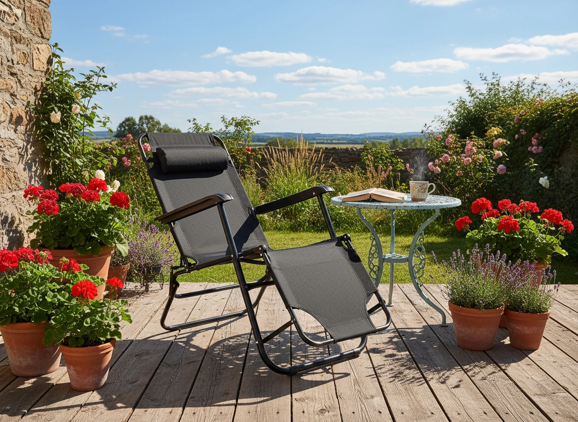 Nastavljiv naslon in možnost popolnega izravnanja vam omogočata, da najdete idealen položaj za branje, sončenje ali popoldanski počitek.