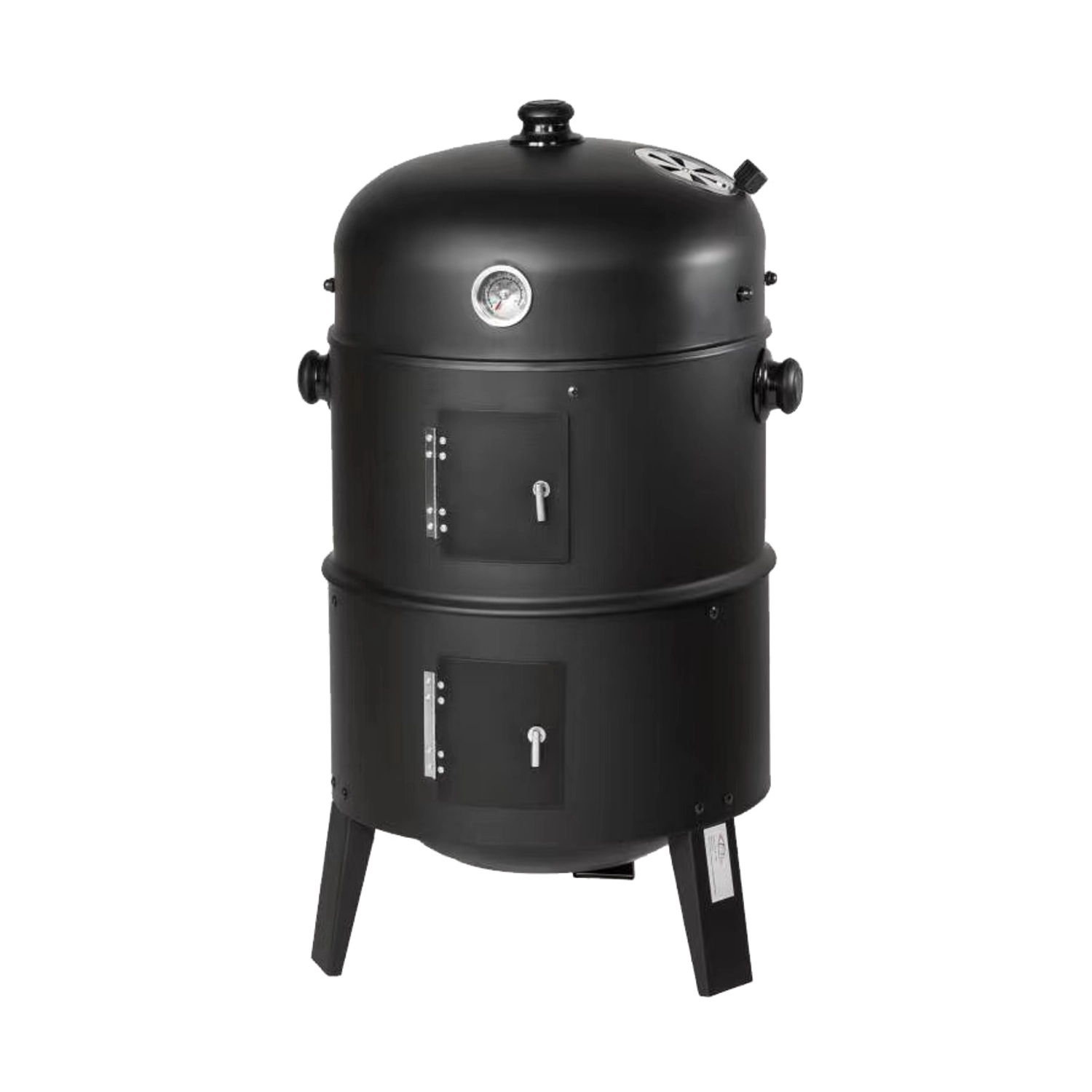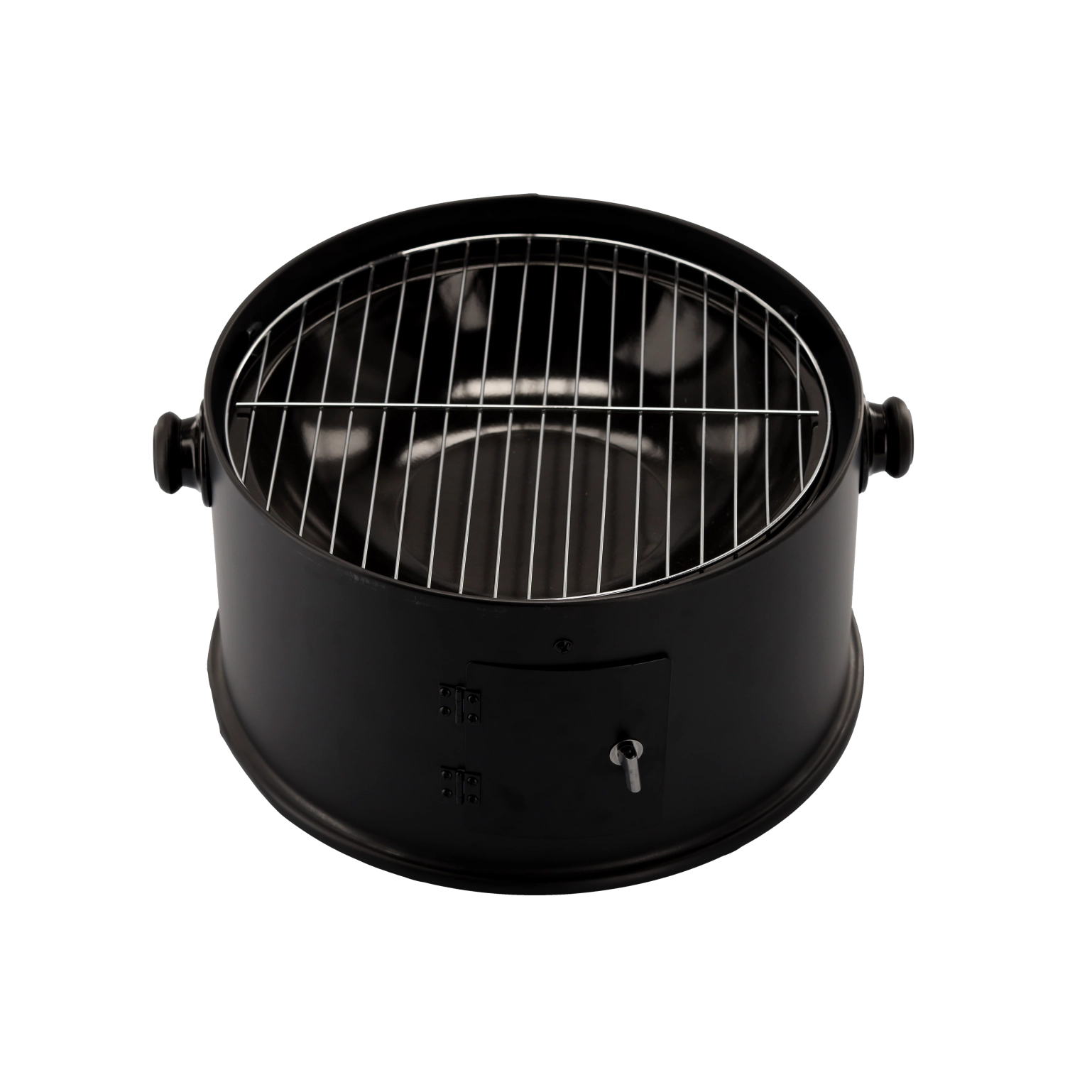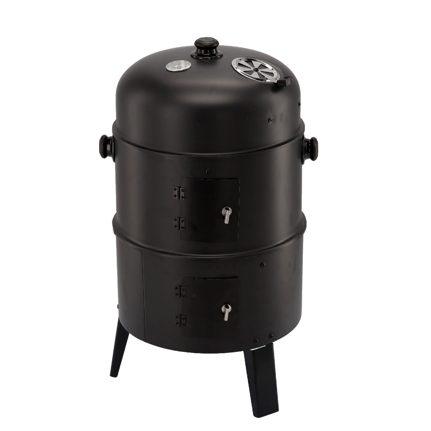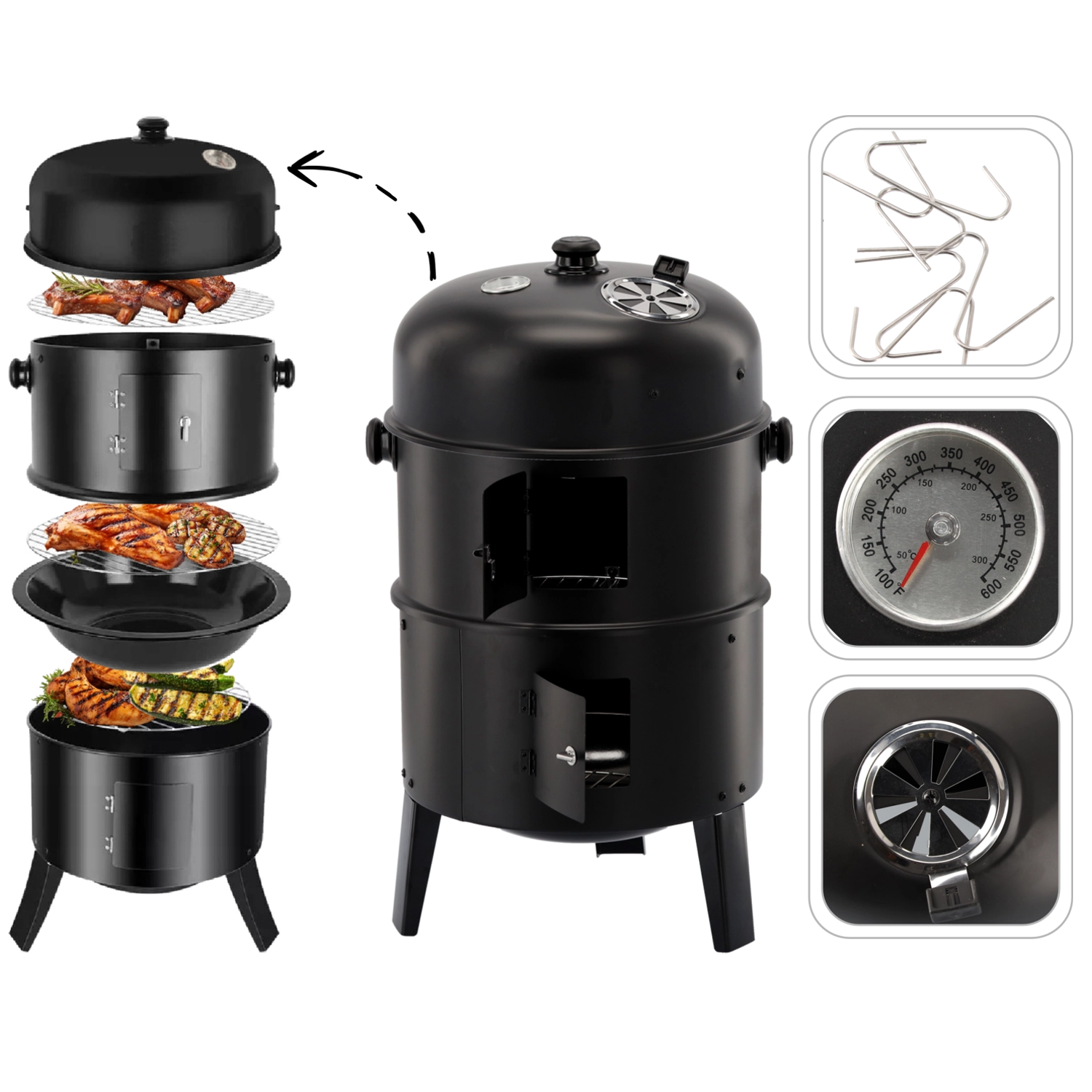 Robustna kovinska konstrukcija s zložljivimi/odstranljivimi segmenti olajša prenašanje in čiščenje. Vključeni so kljukice za dimljenje ter dve emajlirani posodi – vodna in za kurišče z rešetko – za bolj sočne rezultate in čistejše delovanje. Odlična izbira za vrt, teraso in piknik.
