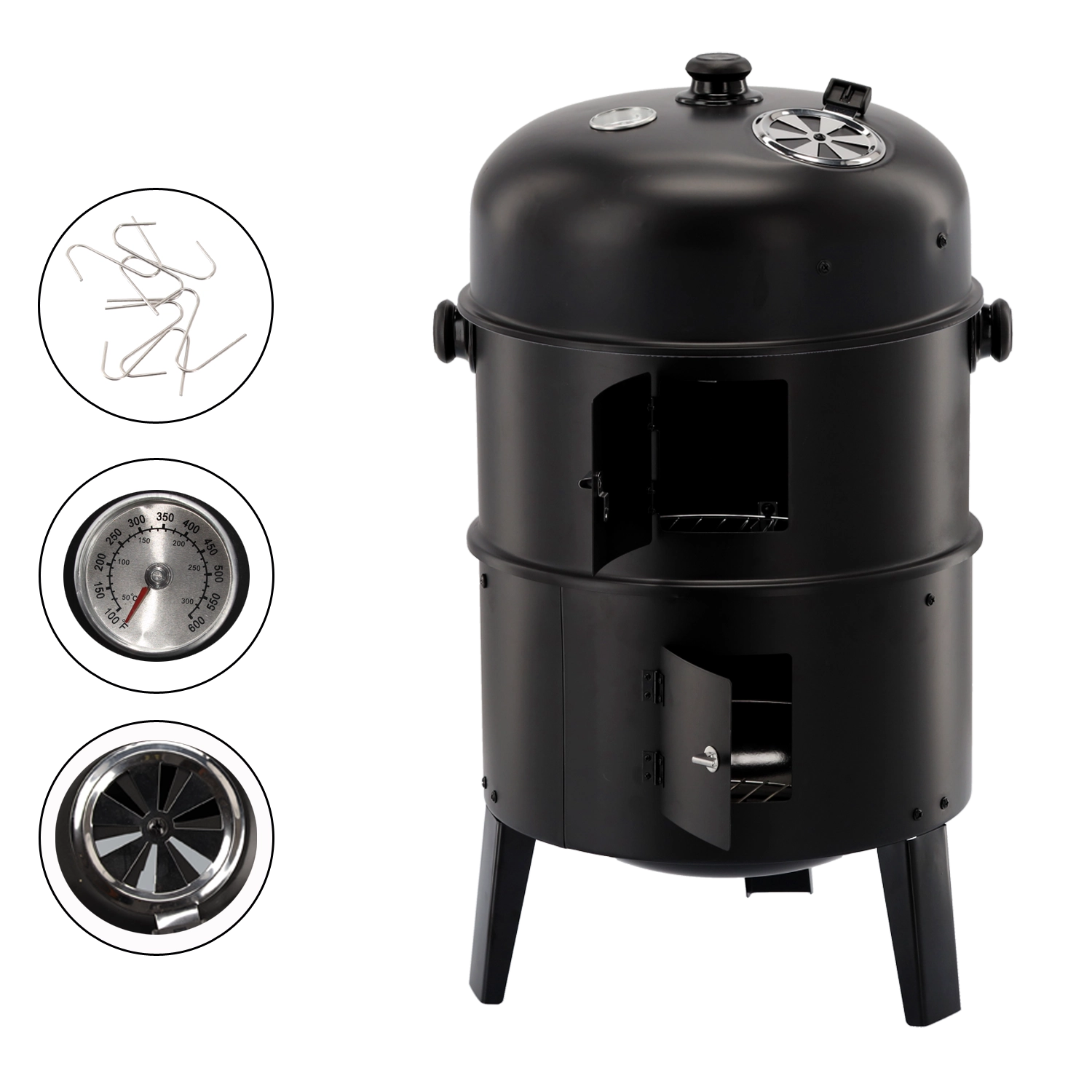 Ta navpični ogleni žar/dimnica ponuja dve ravni rešetk (Ø 37 cm) za hkratno pripravo več jedi ter praktična dvoja vratca za dodajanje goriva ali nadzor jedi. Vgrajeni termometer v kupoli in nastavljiva ventilacija omogočata stabilno temperaturo za počasno dimljenje in klasično pečenje na žaru.