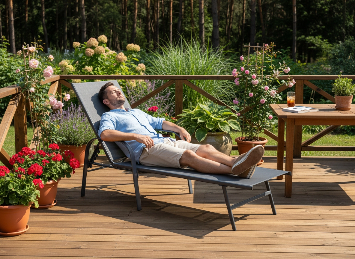 Nastavljiv mehanizem naslonjala omogoča hitro spremembo položaja od sedenja do udobnega ležanja – idealno za branje, sprostitev in sončenje.