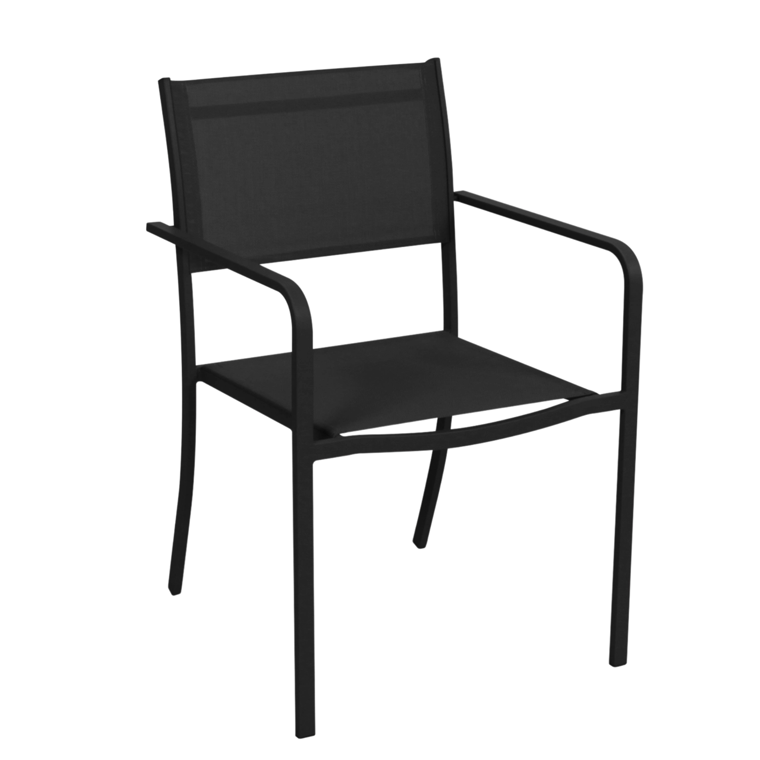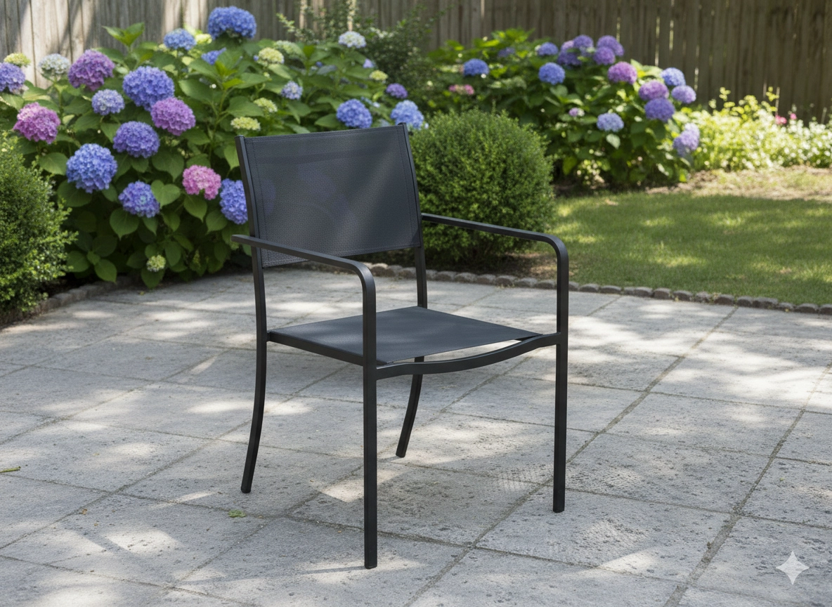 Vrtni črn stol z naslonjali za roke, jeklen okvir in tekstilenska mreža