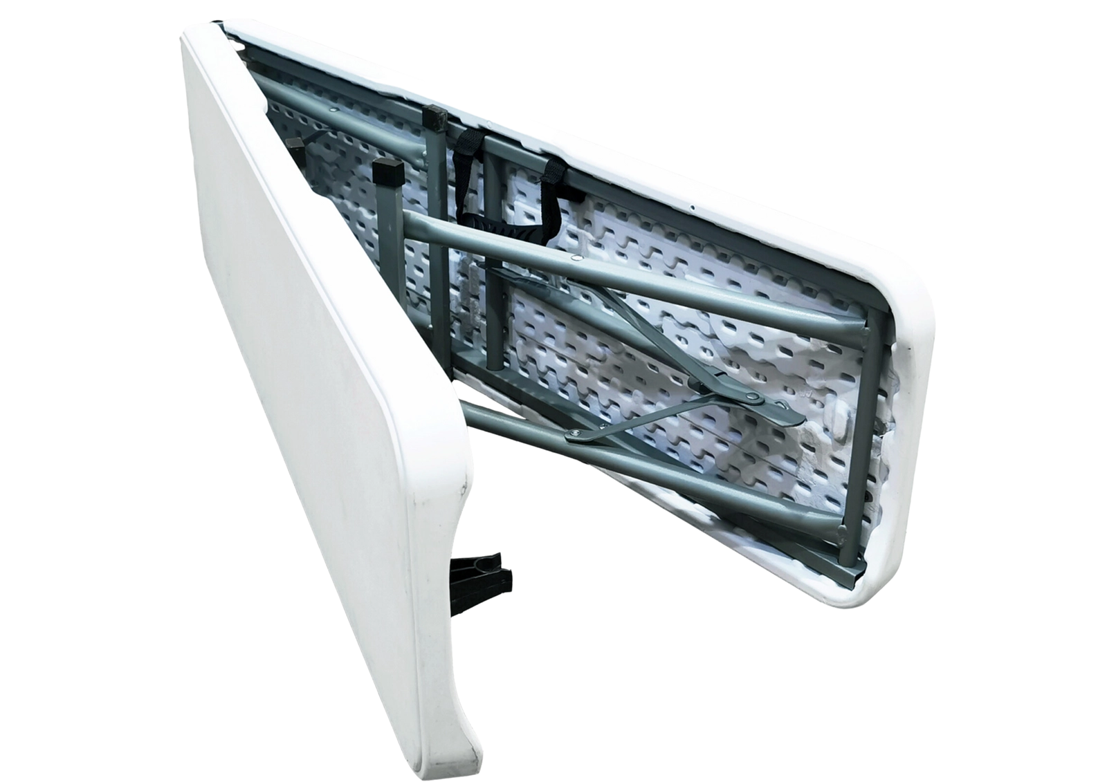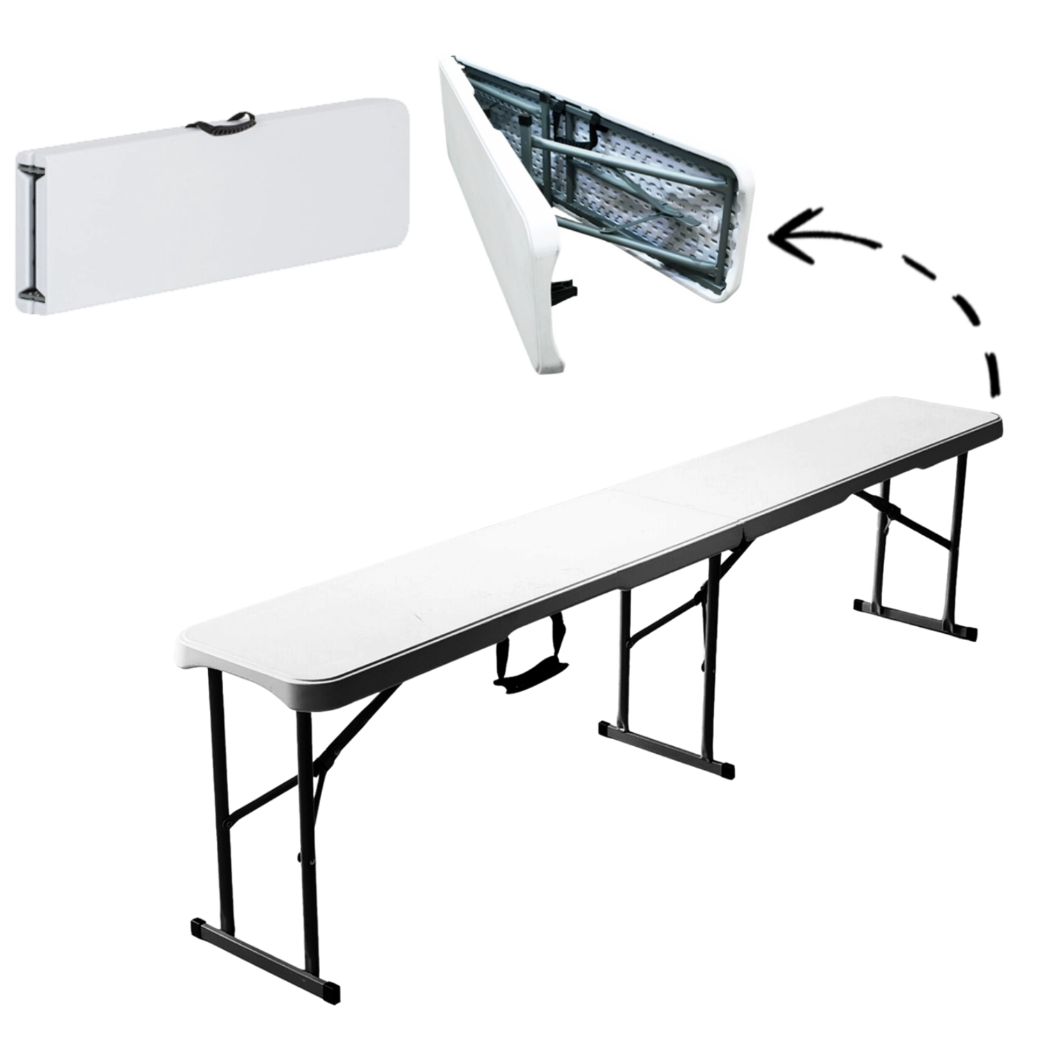 Ta univerzalna zložljiva klop dolžine 180 cm zagotavlja udobno sedenje za 2–3 osebe. Odporna plošča iz HDPE in robustne jeklene noge z oporami zagotavljajo odlično stabilnost v notranjih in zunanjih prostorih. Po zlaganju na polovico in pritrditvi s trakom jo zlahka prenesete z uporabnim ročajem in shranite tudi v manjši prostor.