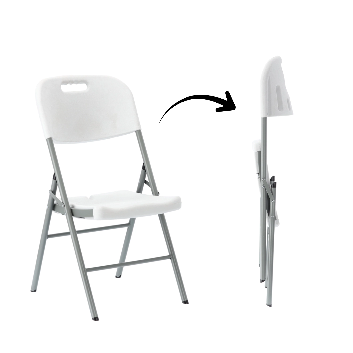 Ta univerzalni bel zložljiv stol združuje vzdržljivost, udobje in enostavno prenosljivost. Jeklena cevna konstrukcija s križnim ojačanjem zagotavlja stabilnost, medtem ko sta sedež in naslon iz HDPE hitro čistljiva in odporna na vremenske vplive. Vgrajen ročaj v naslonu olajša prenašanje.
