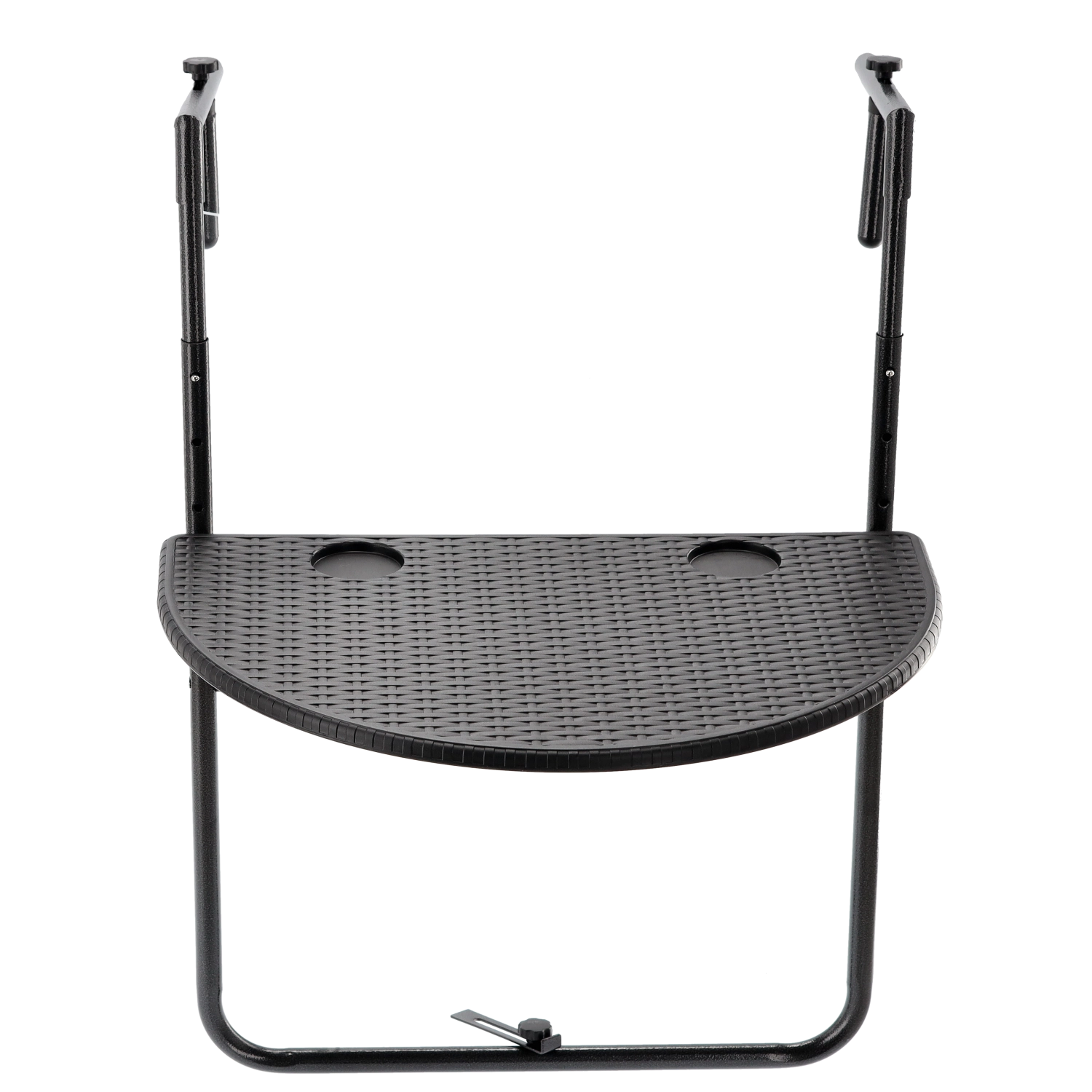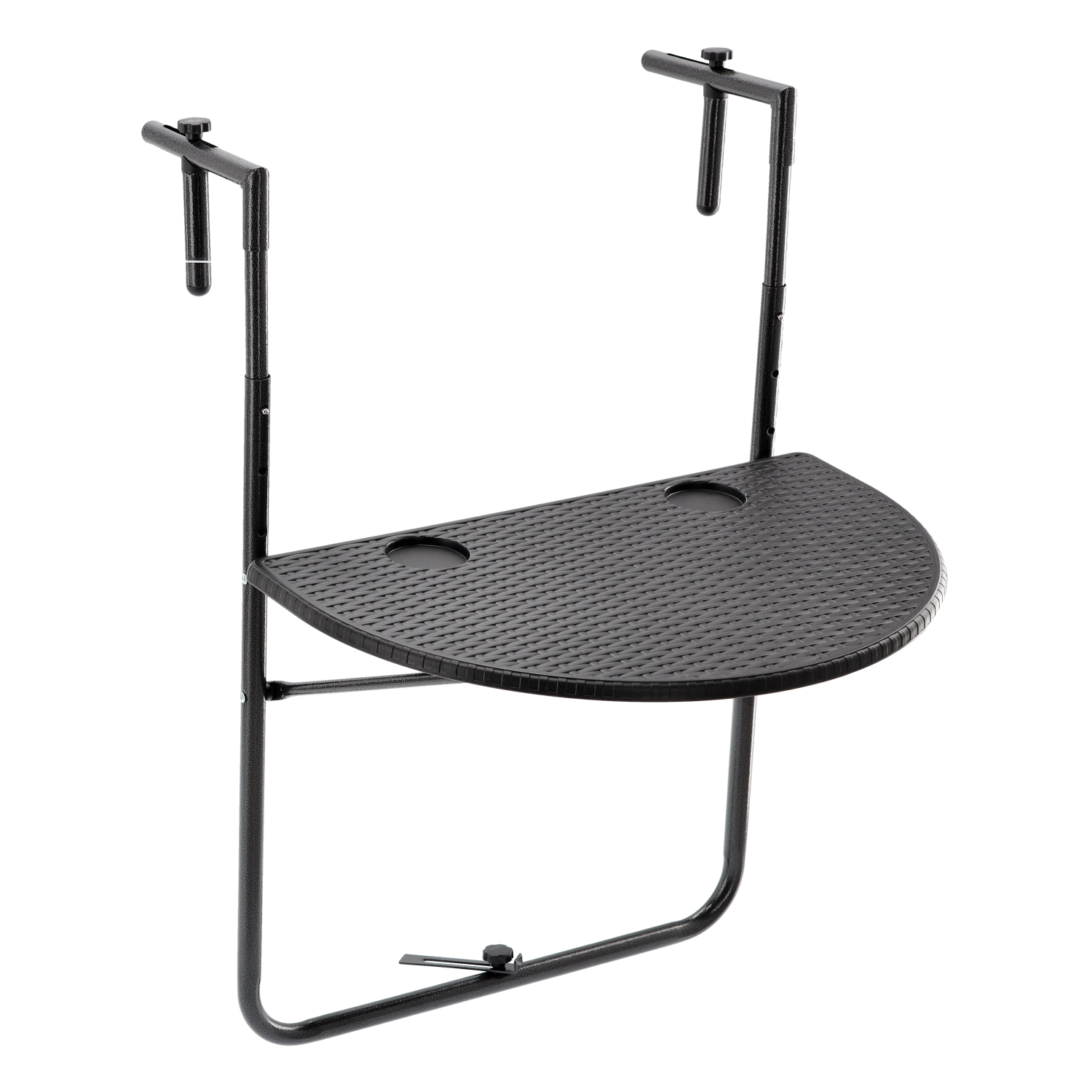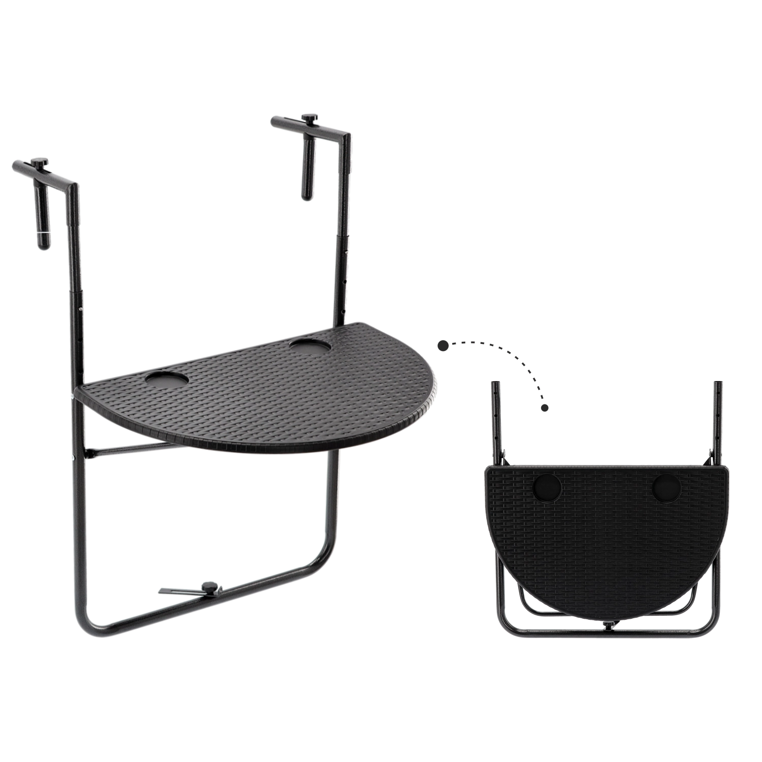Praktična viseča balkonska miza prihrani prostor in spremeni tudi majhen balkon v prijeten kotiček. Zahvaljujoč zložljivi konstrukciji, polkrožni obliki in nastavljivi višini 73–78,5–83,5 cm boste uživali v udobju pri kavi, delu in sprostitvi. Odporna kovinska konstrukcija in plošča v črnem ratan videzu delujeta elegantno in sta enostavni za vzdrževanje.