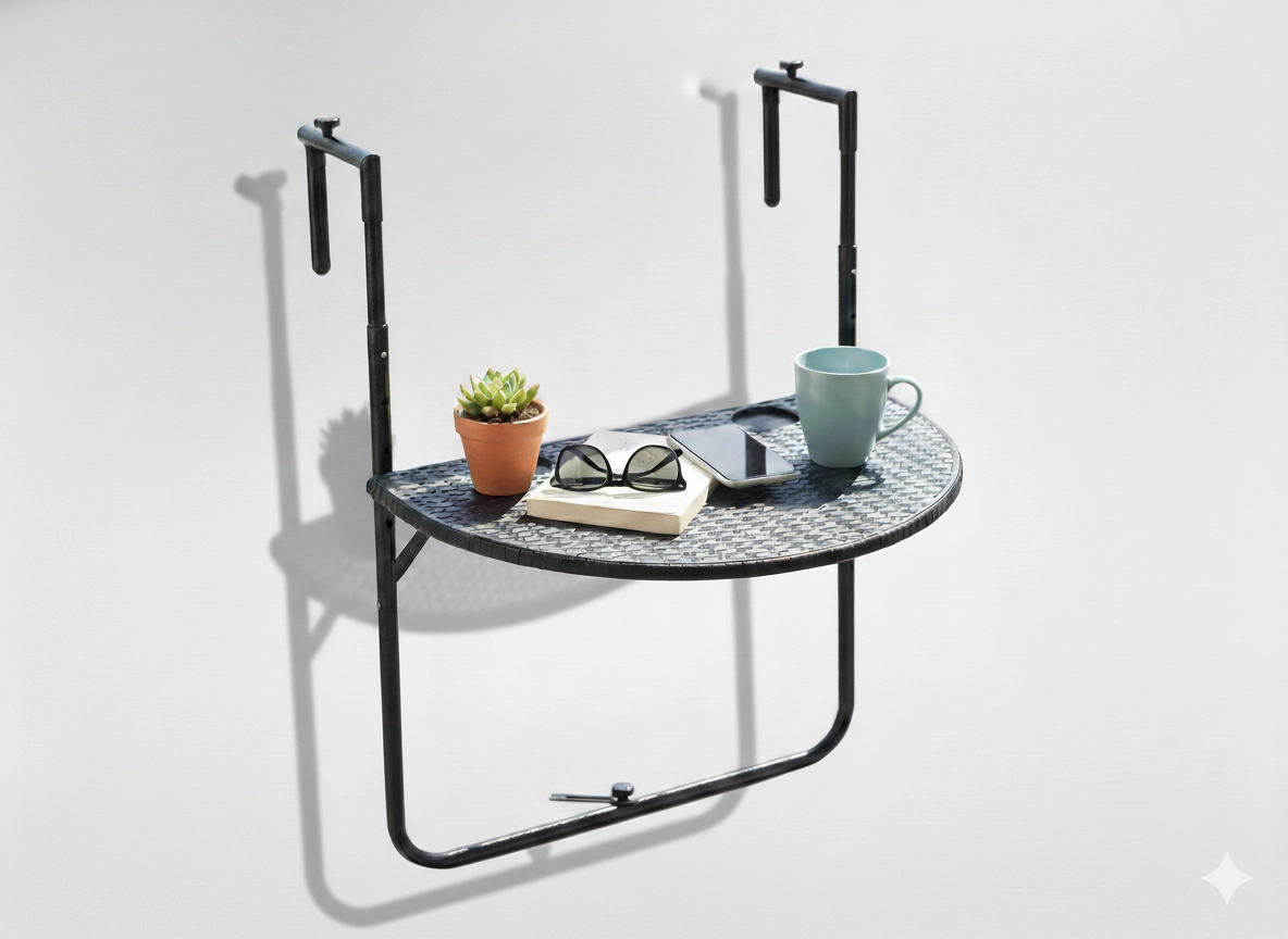 Visečo mizo preprosto obesite na ograjo balkona s pomočjo nastavljivih nosilcev. Polkrožna oblika pametno prihrani prostor, medtem ko integrirane odprtine za pijačo varno držijo kozarce na mestu. Po uporabi mizo z enim gibom preklopite navzdol – idealna rešitev za majhne balkone.