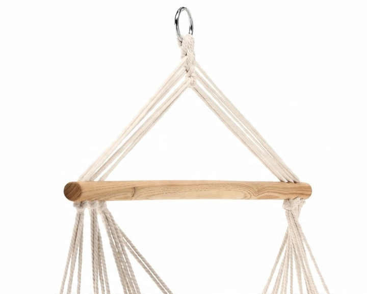 Močne viseče vrvi in čvrsta lesena palica zagotavljajo stabilnost, medtem ko prijetna mešanica bombaža in poliestra nudi udobje in vzdržljivost. Največja nosilnost 150 kg poskrbi za brezskrbno vsakodnevno uporabo.